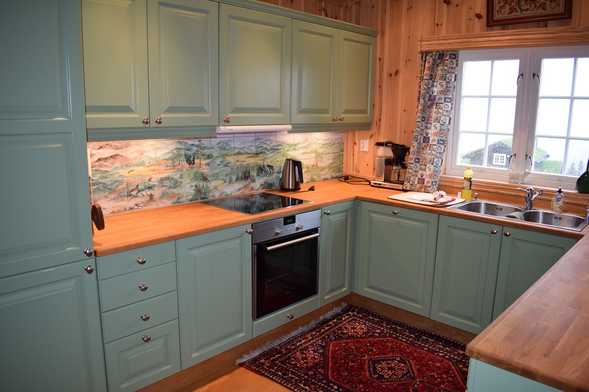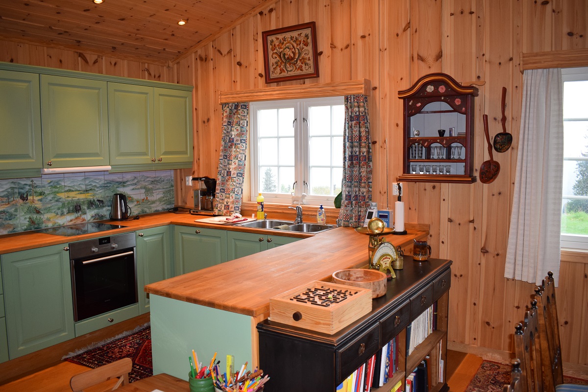 Kjøkken utstyrt for selvhushold: Kjøleskap/fryser, oppvaskmaskin, komfyr med 4 plater, kaffetrakter og vannkoker.