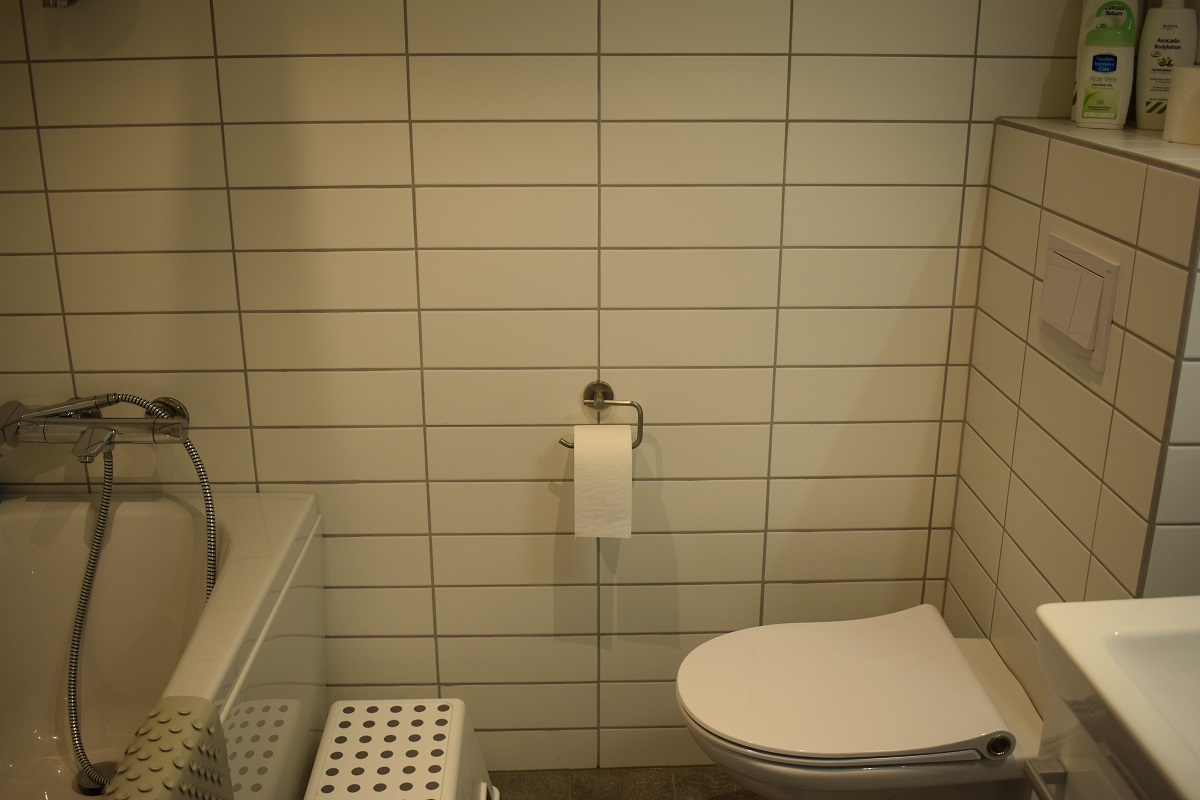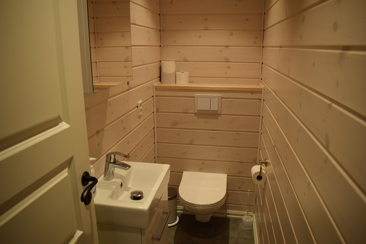 Bad 1: Dusj, toalett og vask. Sauna. Bad 2: Badekar med dusj, toalett og vask. Bad 3: ett ekstra toalett. Vaskemaskin og tørketrommel i teknisk rom.
