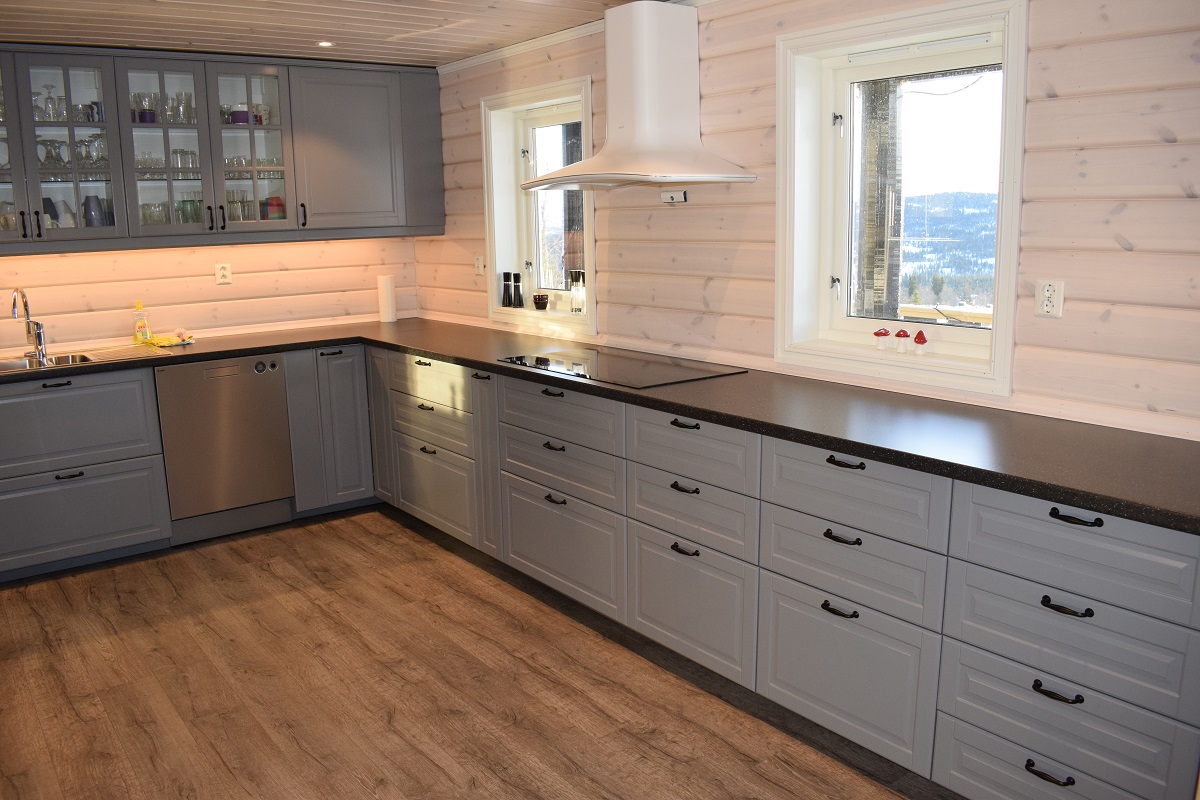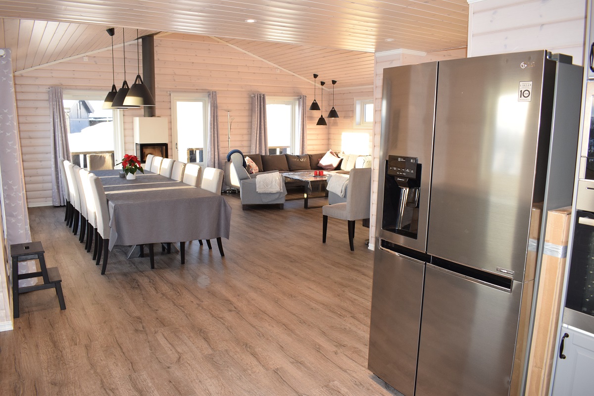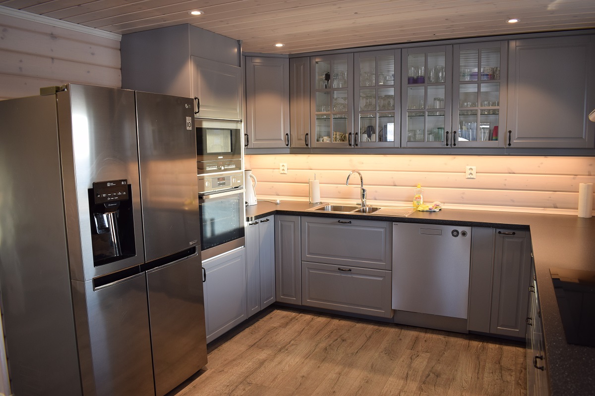 Stort kjøkken utstyrt for selvhushold: Stort kjøleskap med egen fryser, oppvaskmaskin, komfyr med 6 soner, mikrobølgeovn, kaffetrakter og vannkoker.