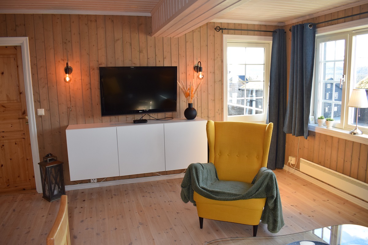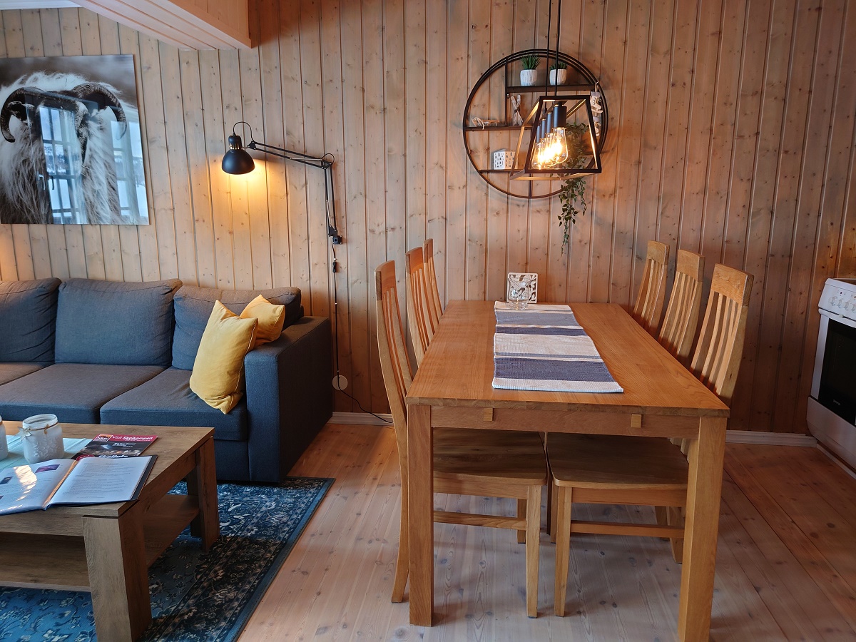 Stue og kjøkken i åpen løsning. Stue inneholder: Sofa, TV, internett. Spisebord med plass til 6 personer. Balkong.