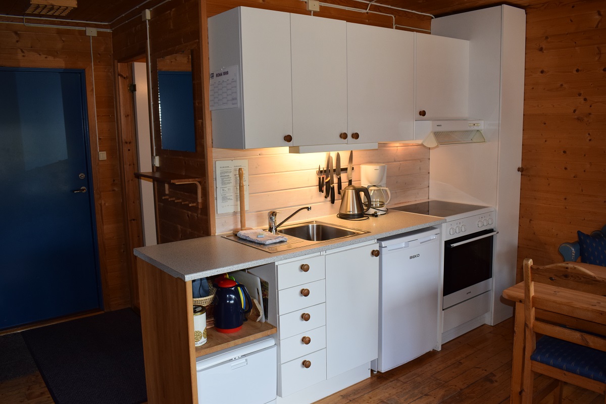 KJØKKEN Kjøkken utstyrt for selvhushold: Lite kjøleskap, komfyr med 4 kokeplater, oppvaskmaskin, kaffetrakter og vannkoker.