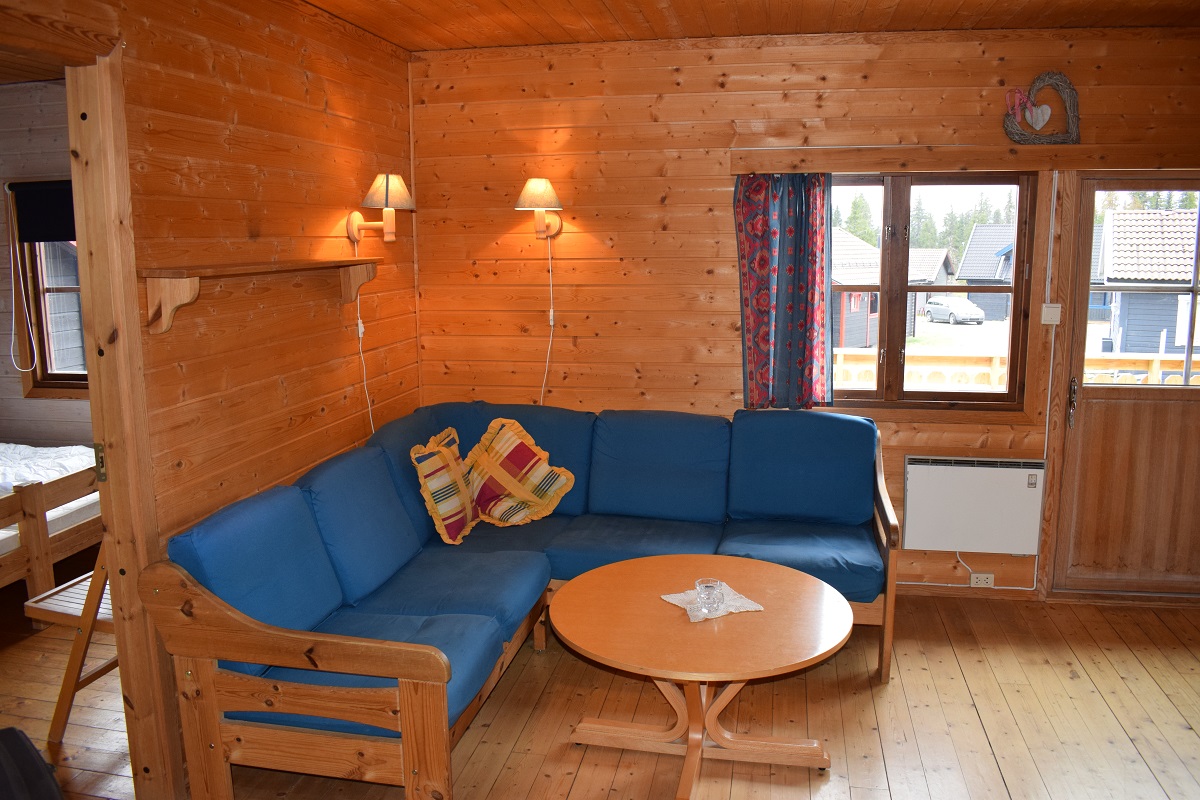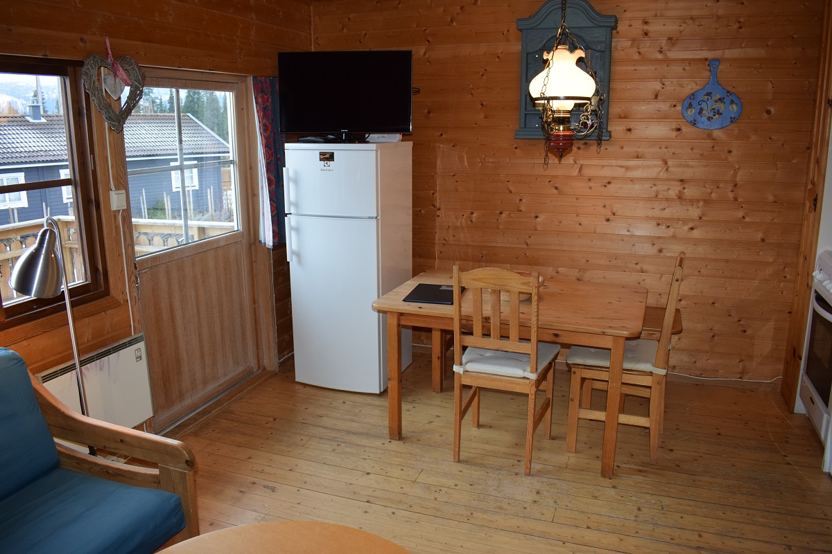 Stue og kjøkken i åpen løsning. Stue inneholder: Sofa, TV, peisovn, internett. Spisebord med plass til 6 personer. En ekstra stue i forlengelse av det ene soverommet. Balkong.