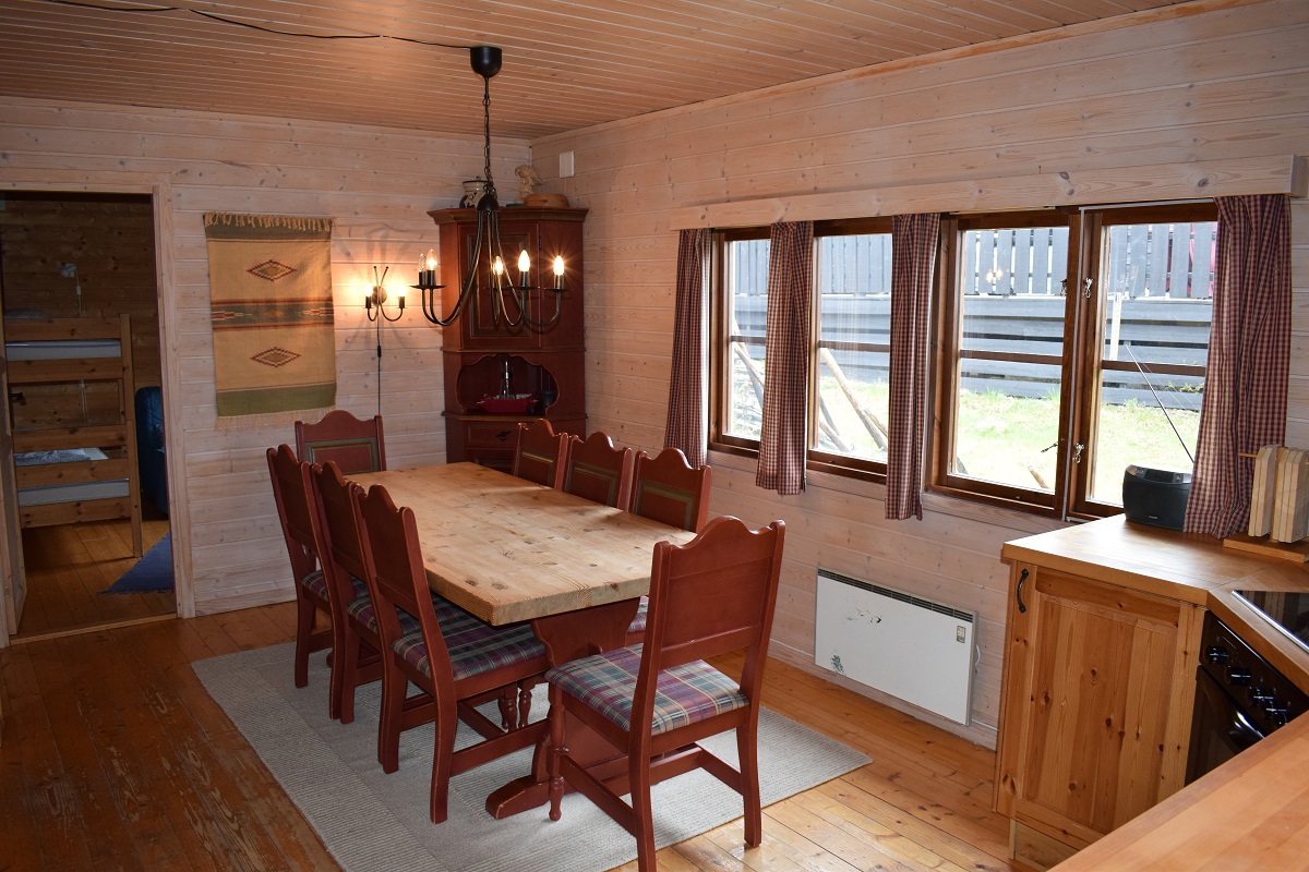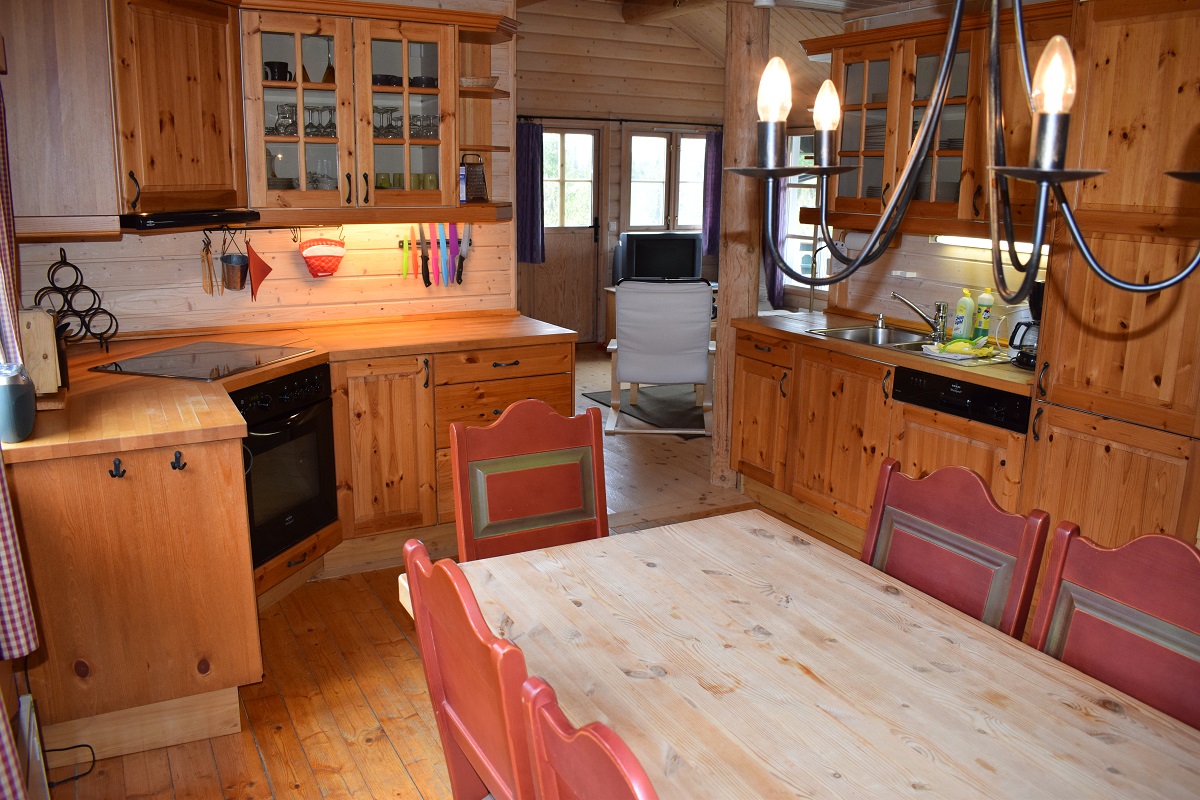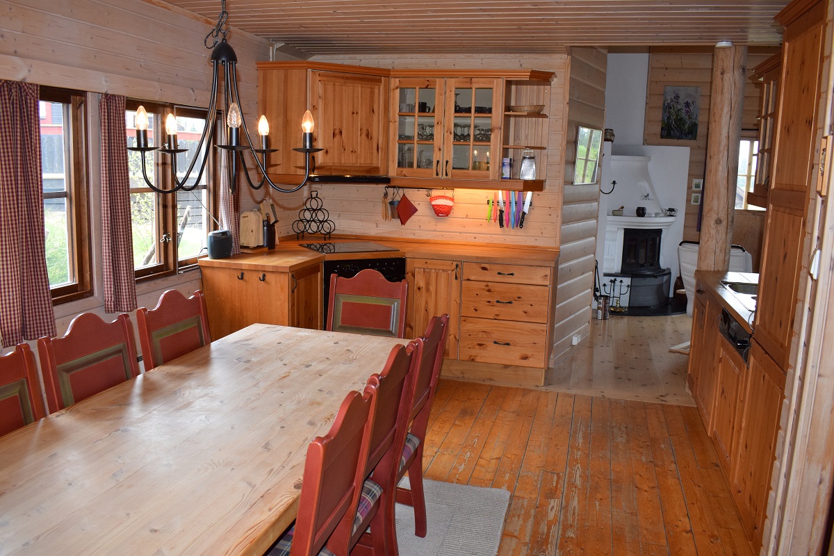 Kjøkken utstyrt for selvhushold: Kjøleskap/fryser, oppvaskmaskin, komfyr med 4 plater, kaffetrakter og vannkoker. Stort spisebord med god plass til 6 personer.