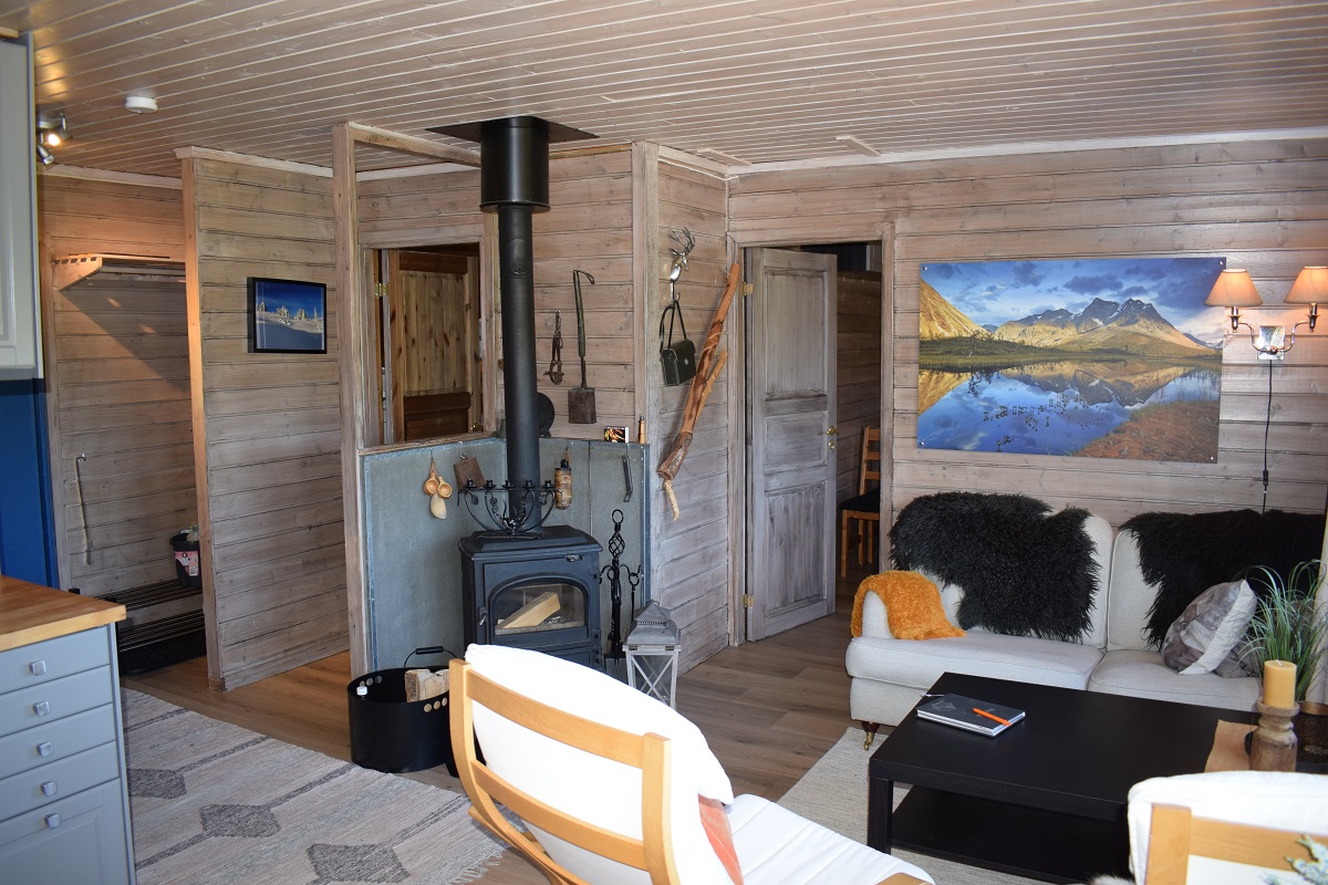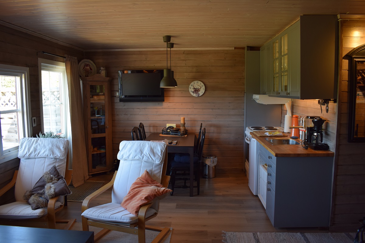 Stue og kjøkken i åpen løsning. Stue inneholder: Sofa, TV, peisovn, internett. Spisebord med plass til 5 personer. Balkong.