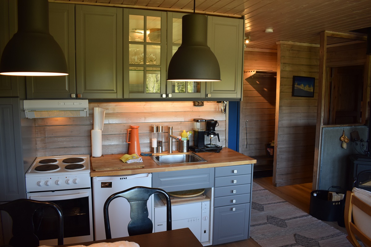 Kjøkken utstyrt for selvhushold: Lite kjøleskap, oppvaskmaskin, komfyr med 4 plater, kaffetrakter og vannkoker.