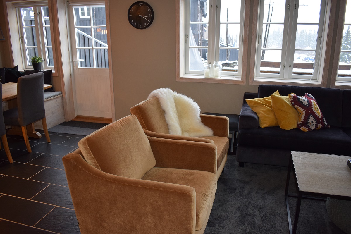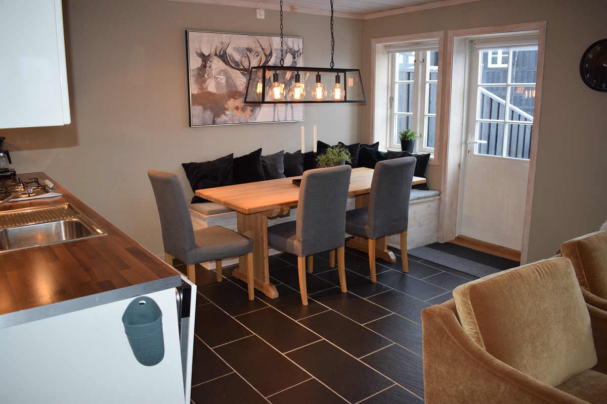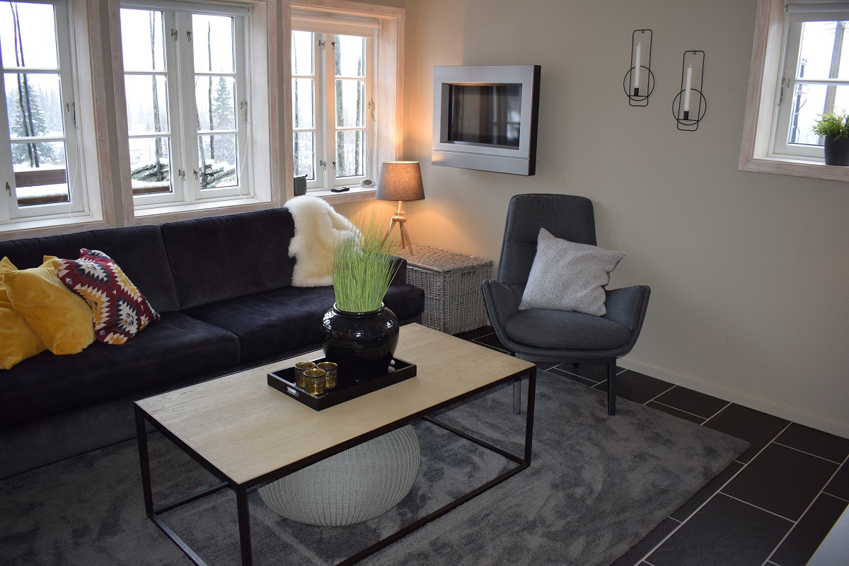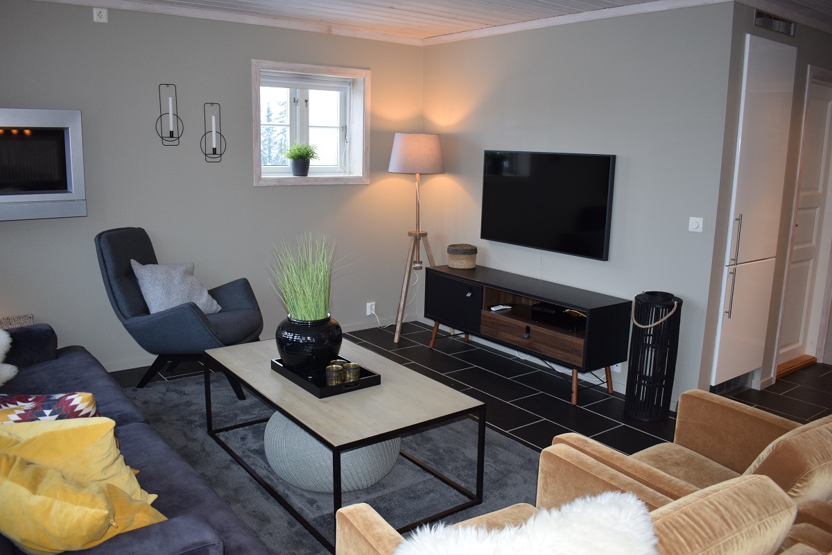 Stue og kjøkken i åpen løsning. Stue inneholder: Sofa, TV, gasspeis. Internett. Romslig inngjerdet uteplass/terrasse.