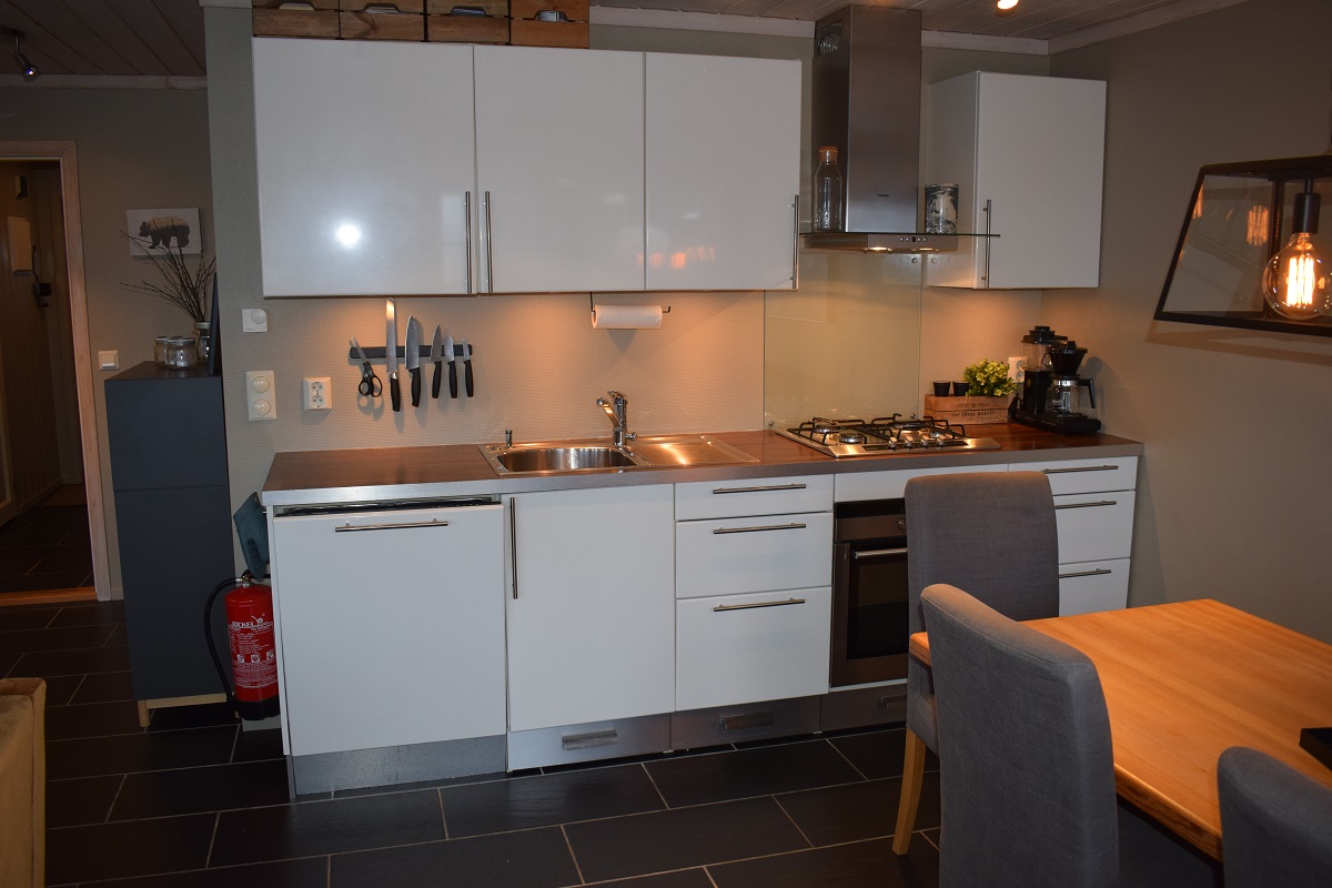 Kjøkken utstyrt for selvhushold: Kjøleskap/fryser, oppvaskmaskin, gasskomfyr med 4 bluss, kaffetrakter og vannkoker.