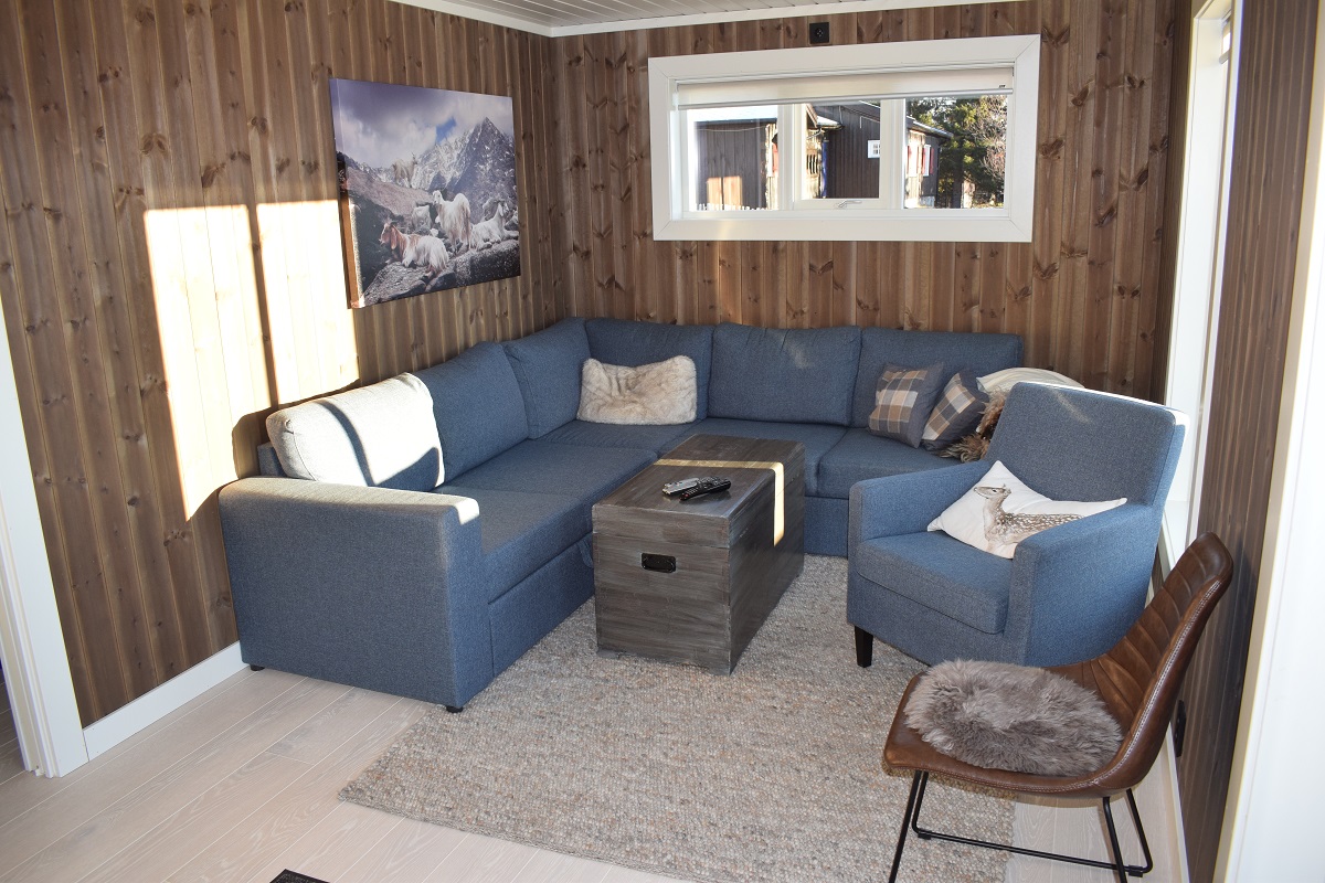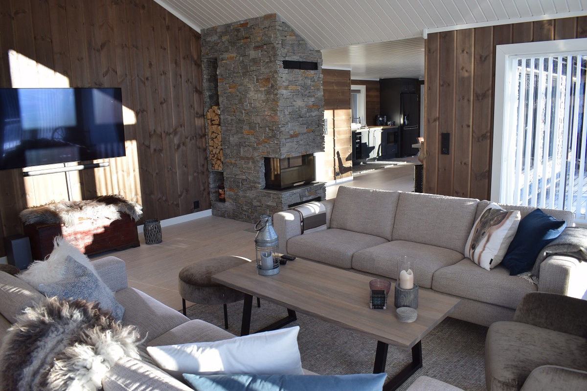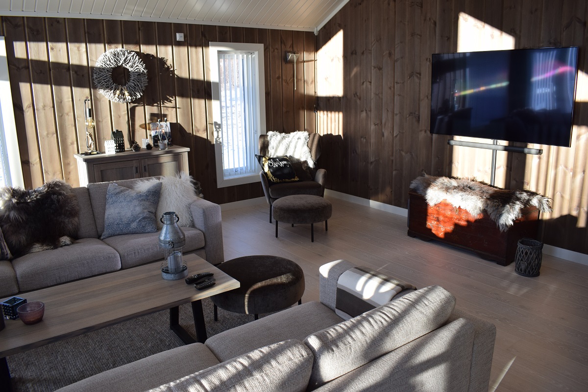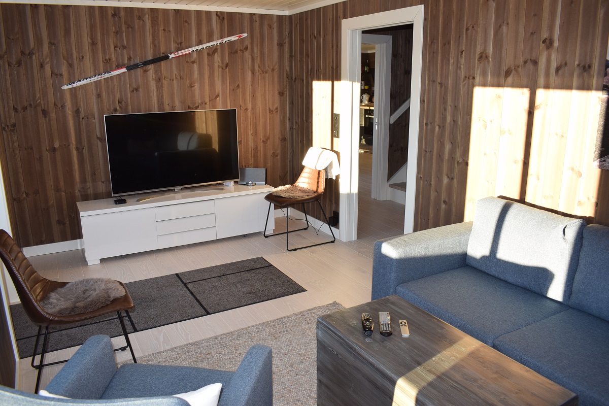 Hytte med 2 etasjer. Stor stue inneholder: Sofa, peis, Smart-TV, internett. Stort spisebord med plass til 15 personer. Ekstra TV-stue i første etasje, samt en mindre stue oppe i andre etase. Stor solvendt terrasse med fin oversikt over løyper og bakker som ligger rett utenfor hyttedøren.