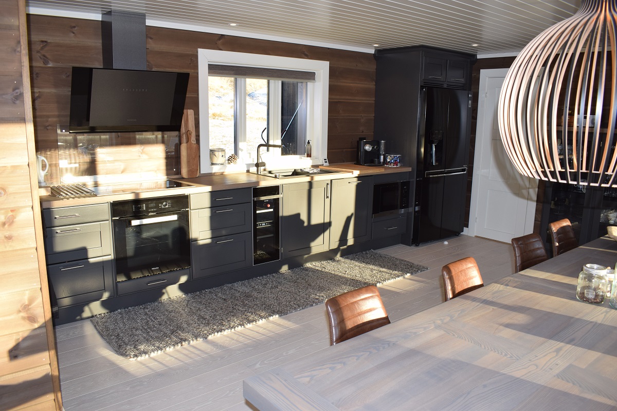 Stort kjøkken utstyrt for selvhushold: Stort kjøleskap med egen fryser, oppvaskmaskin, komfyr med 4 soner, mikrobølgeovn, kaffetrakter og vannkoker.