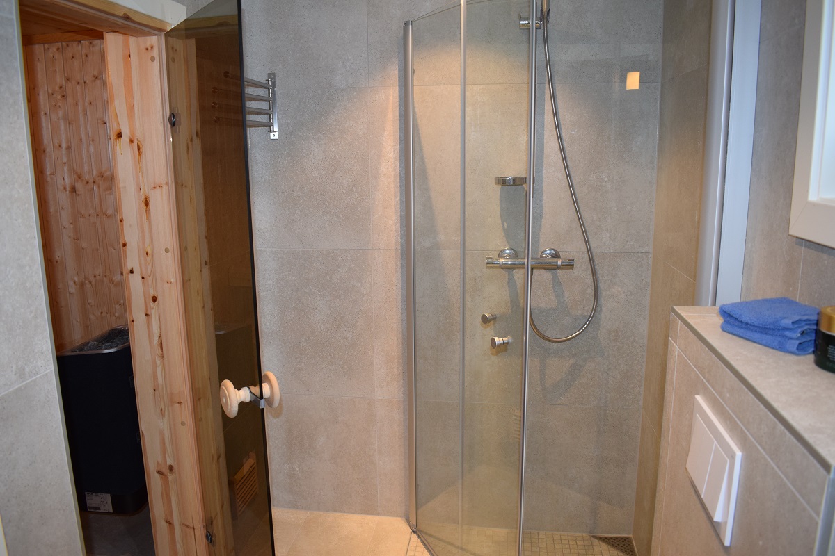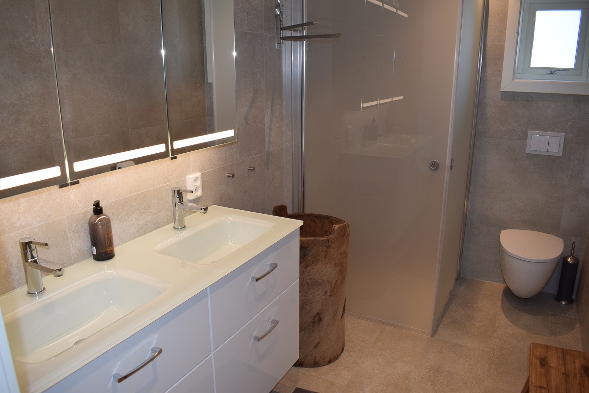 Bad 1: Dusj, toalett og vask. Sauna. Bad 2: Dusj, toalett og vask. Vaskemaskin. Begge badene er i første etasje.