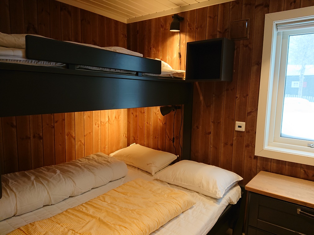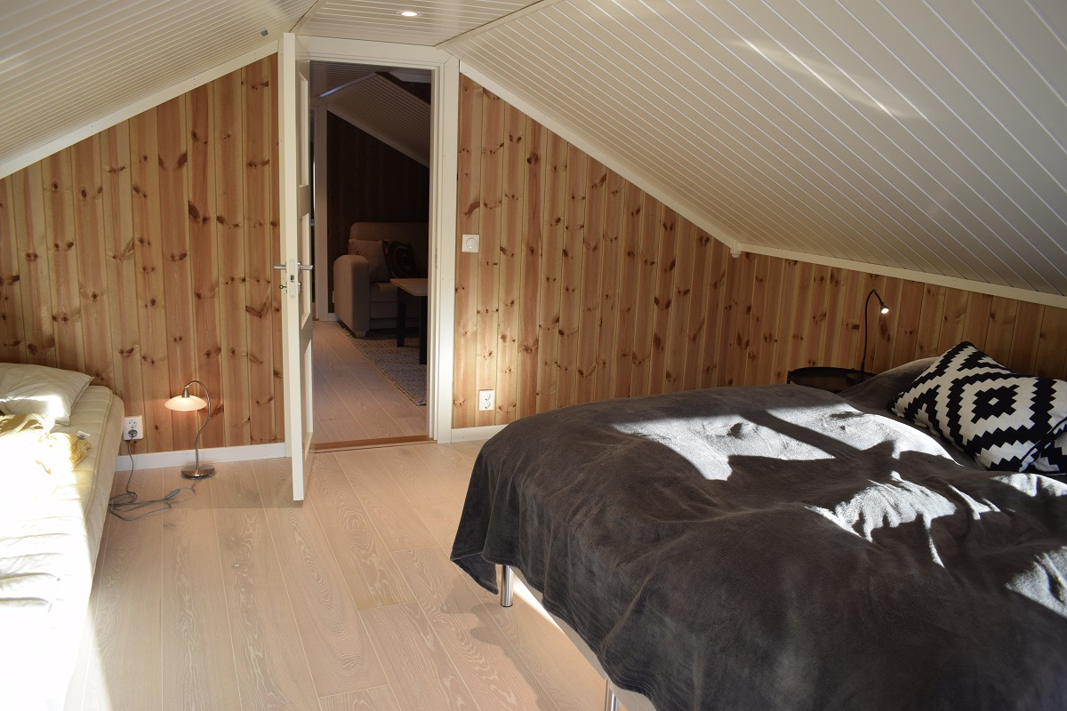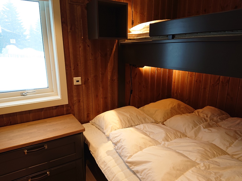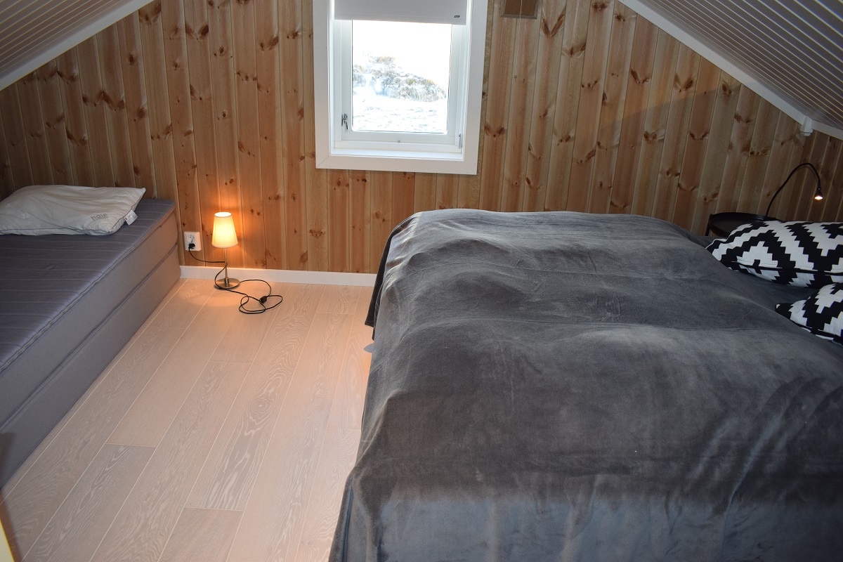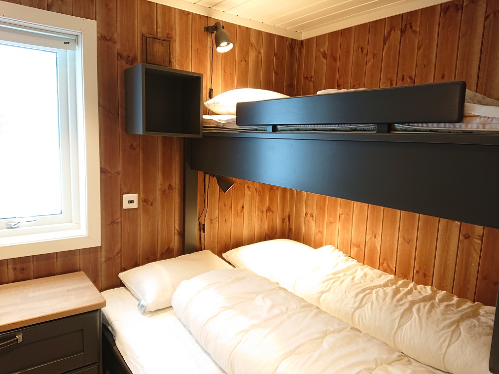 Soverom 1-2: begge med en dobbeltseng og en enkeltseng i andre etasje. Soverom 3-5: alle med en familiekøye med 150cm bred underkøye og 90cm bred overkøye i første etasje.