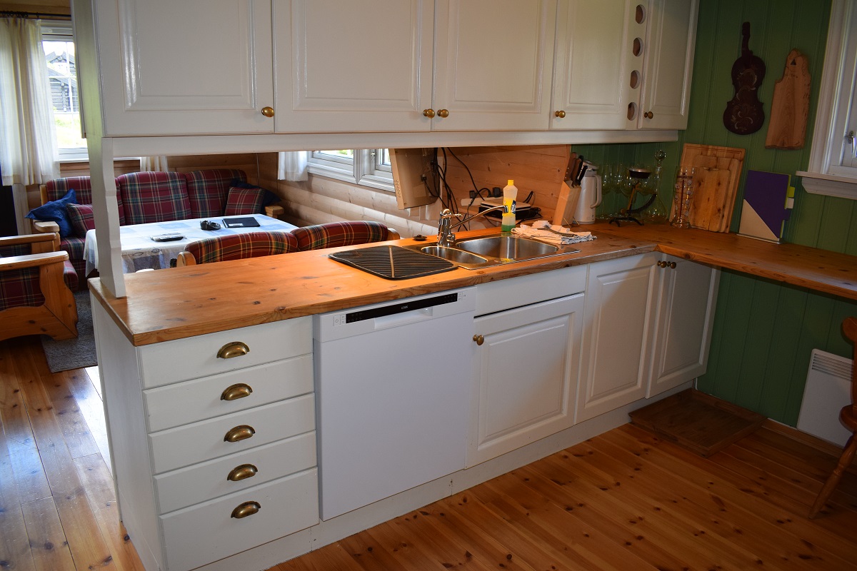 Kjøkken utstyrt for selvhushold: Kjøleskap, komfyr med 4 plater, kaffetrakter og vannkoker. Oppvaskmaskin og liten mikrobølgeovn. Spisebord med plass til 9 personer.