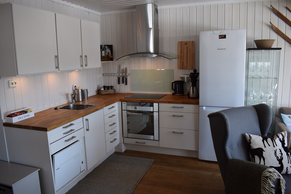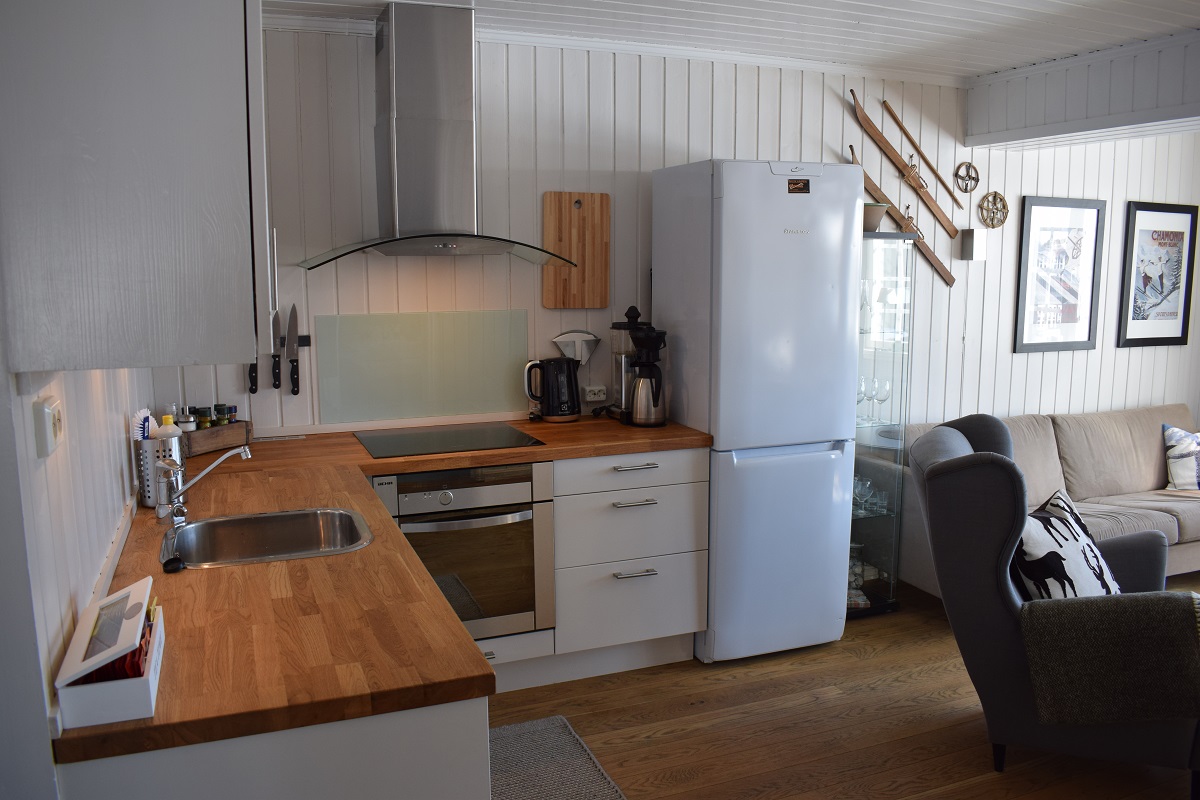 Kjøkken utstyrt for selvhushold: Stort kombikjøleskap, liten oppvaskmaskin, komfyr med 4 plater, kaffetrakter og vannkoker.