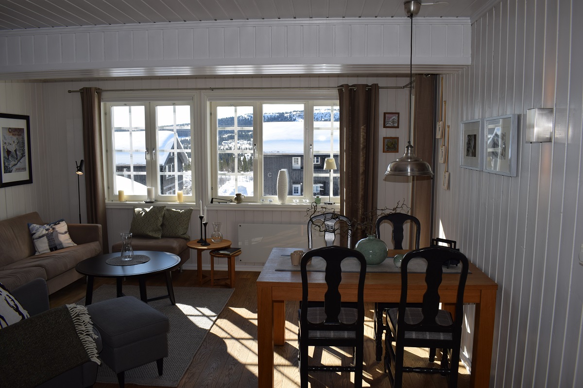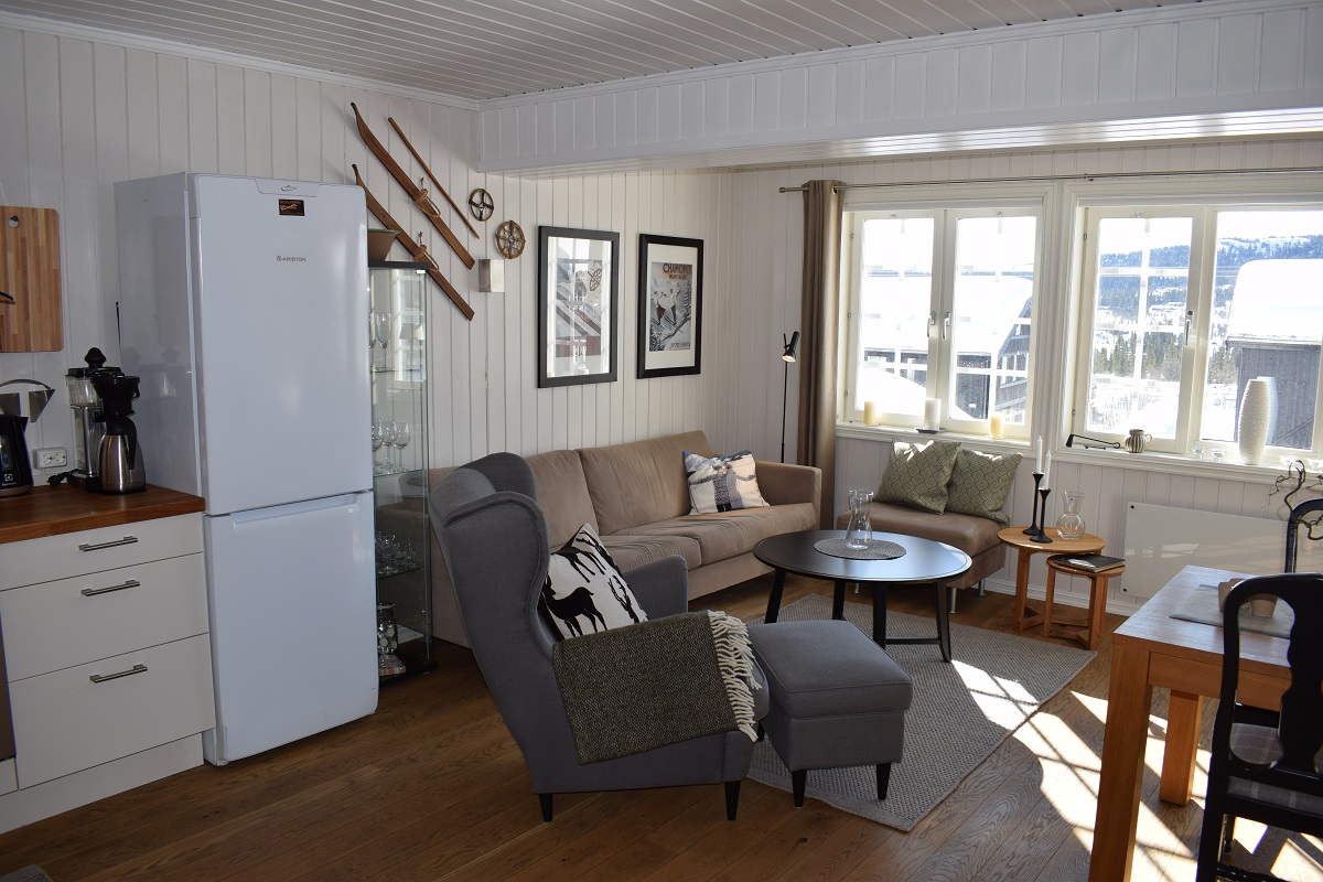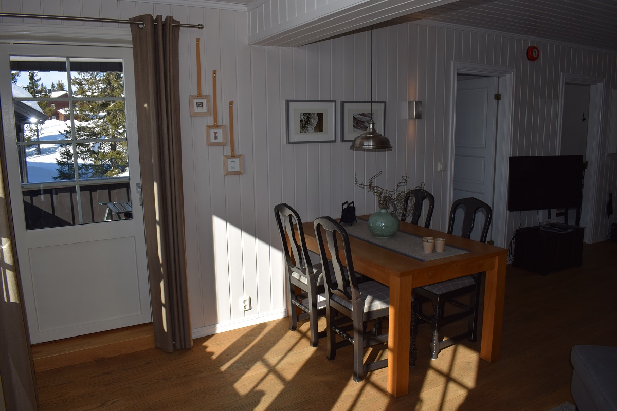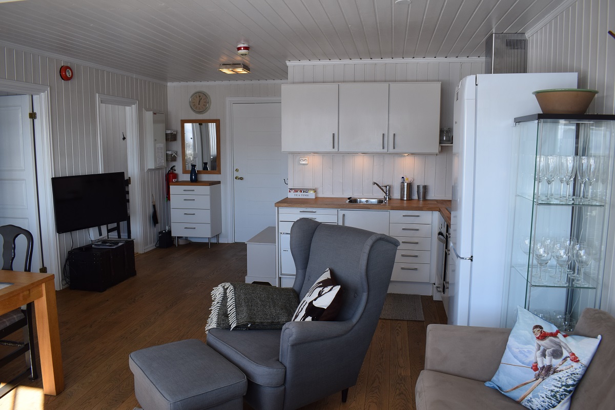 Stue og kjøkken i åpen løsning. Stue inneholder: Sofa, TV, internett. Spisebord med plass til 5 personer. Balkong