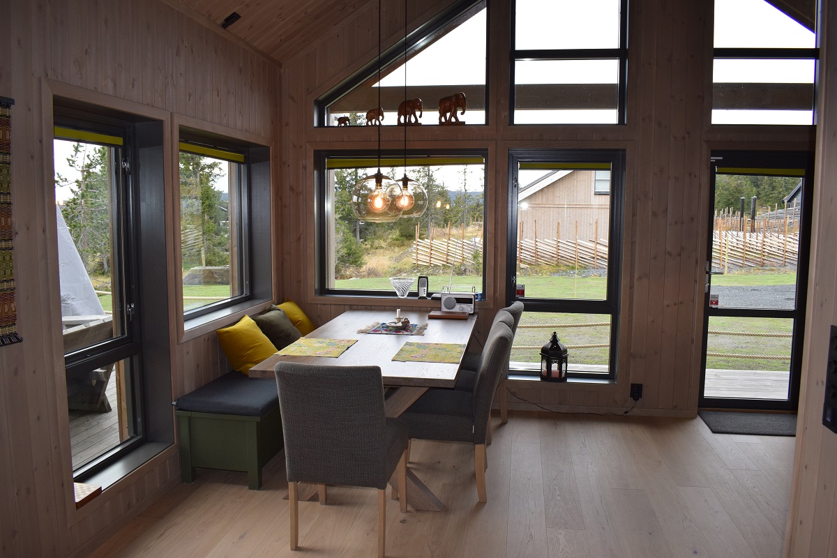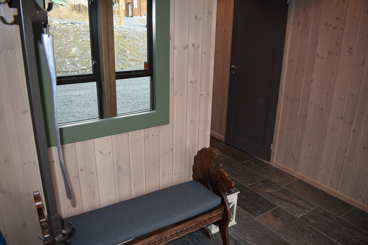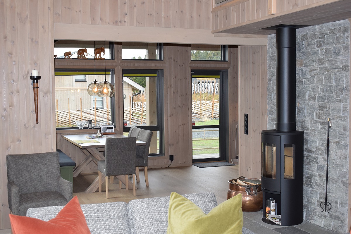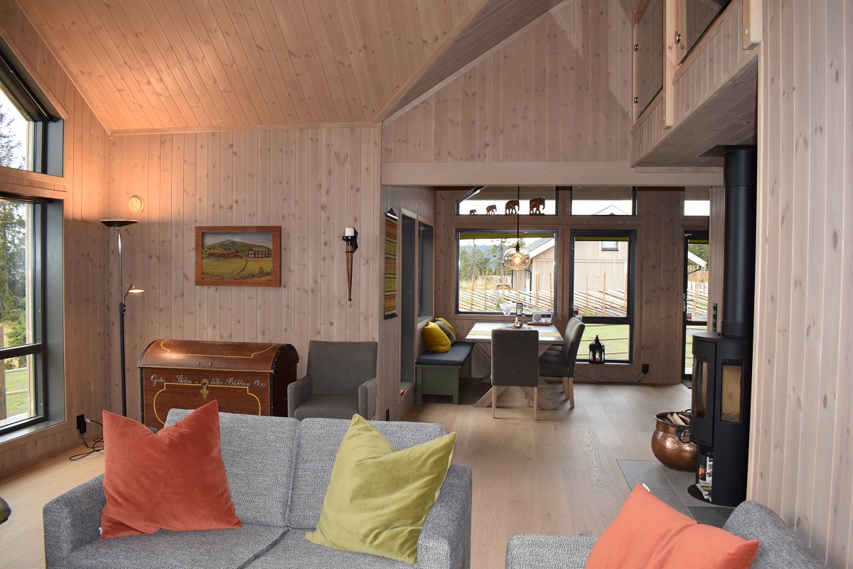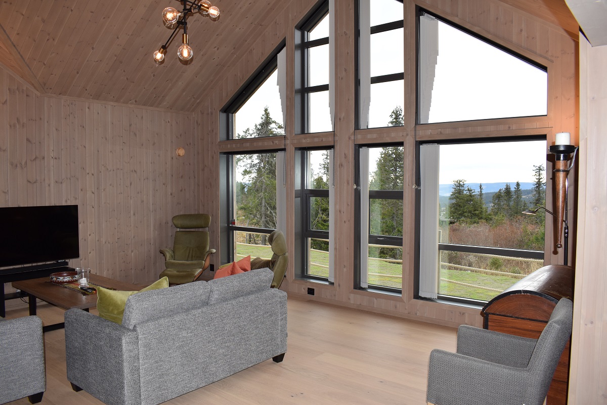 Stue inneholder: Sofa og 2 lenestoler, peisovn, spisebord med plass til 8-10 personer. Fritt internett. Kjøkken og stue/spisestue i åpen løsning. Stor veranda og sydvendt hytte med utsikt.