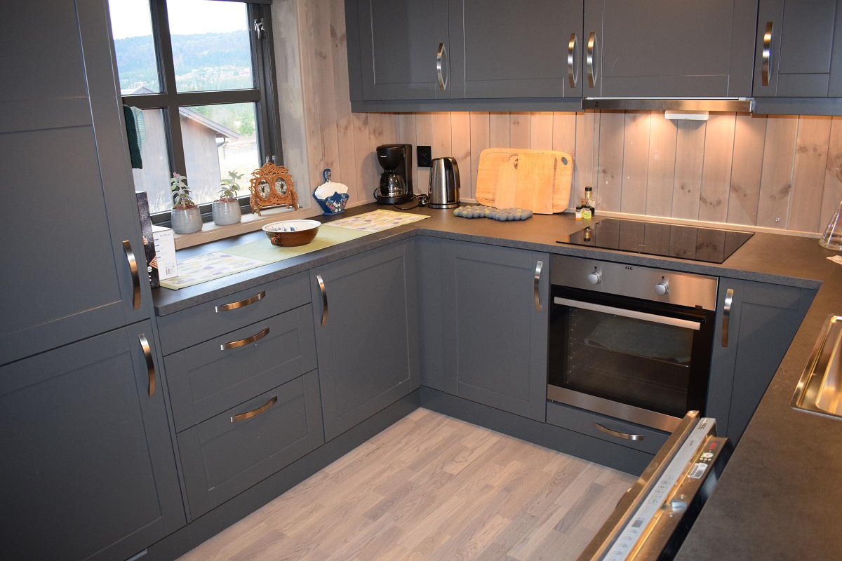 Kjøkken utstyrt for selvhushold: Stort kombiskap med kjøl og frys, oppvaskmaskin, komfyr med 4 soner, kaffetrakter og vannkoker.