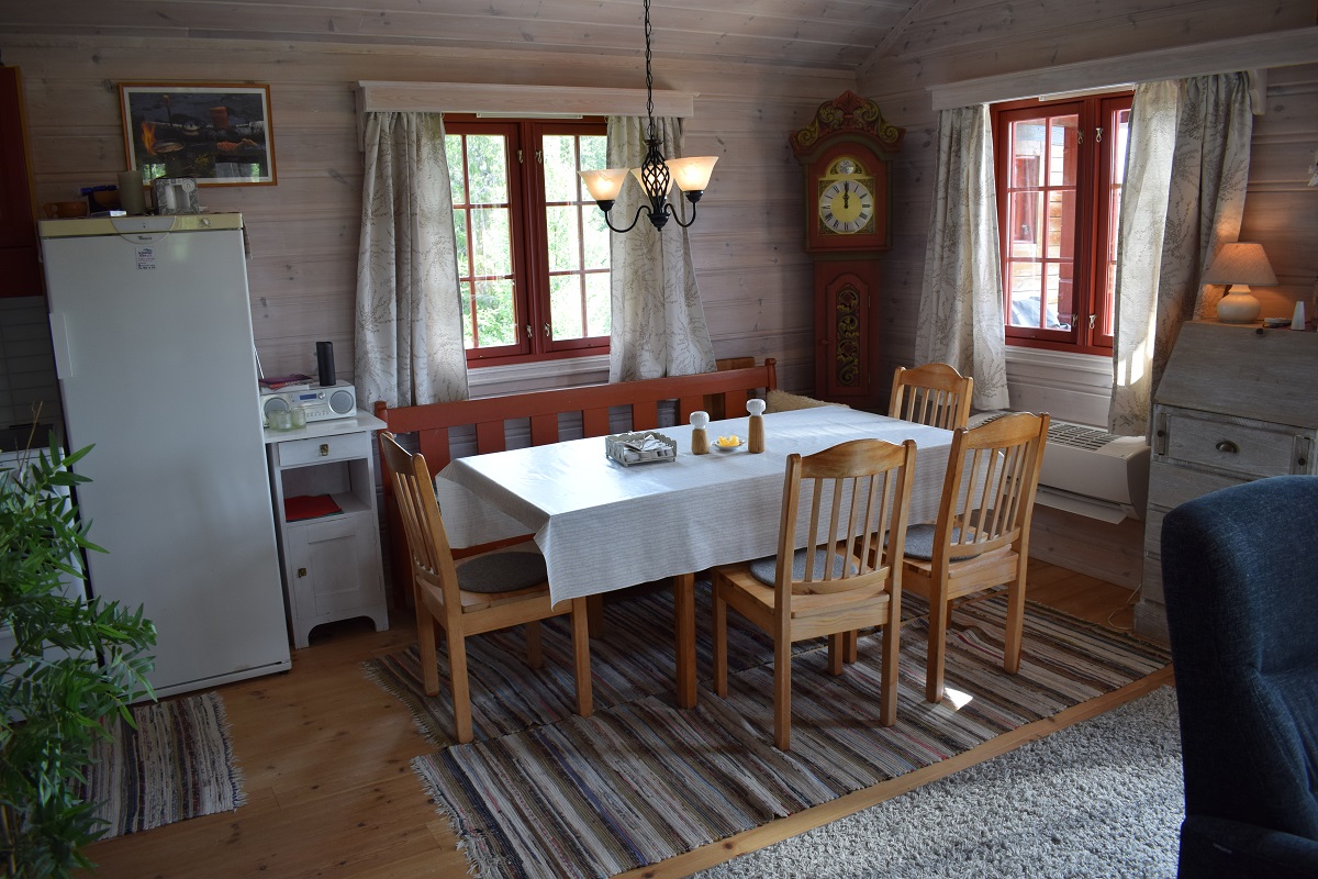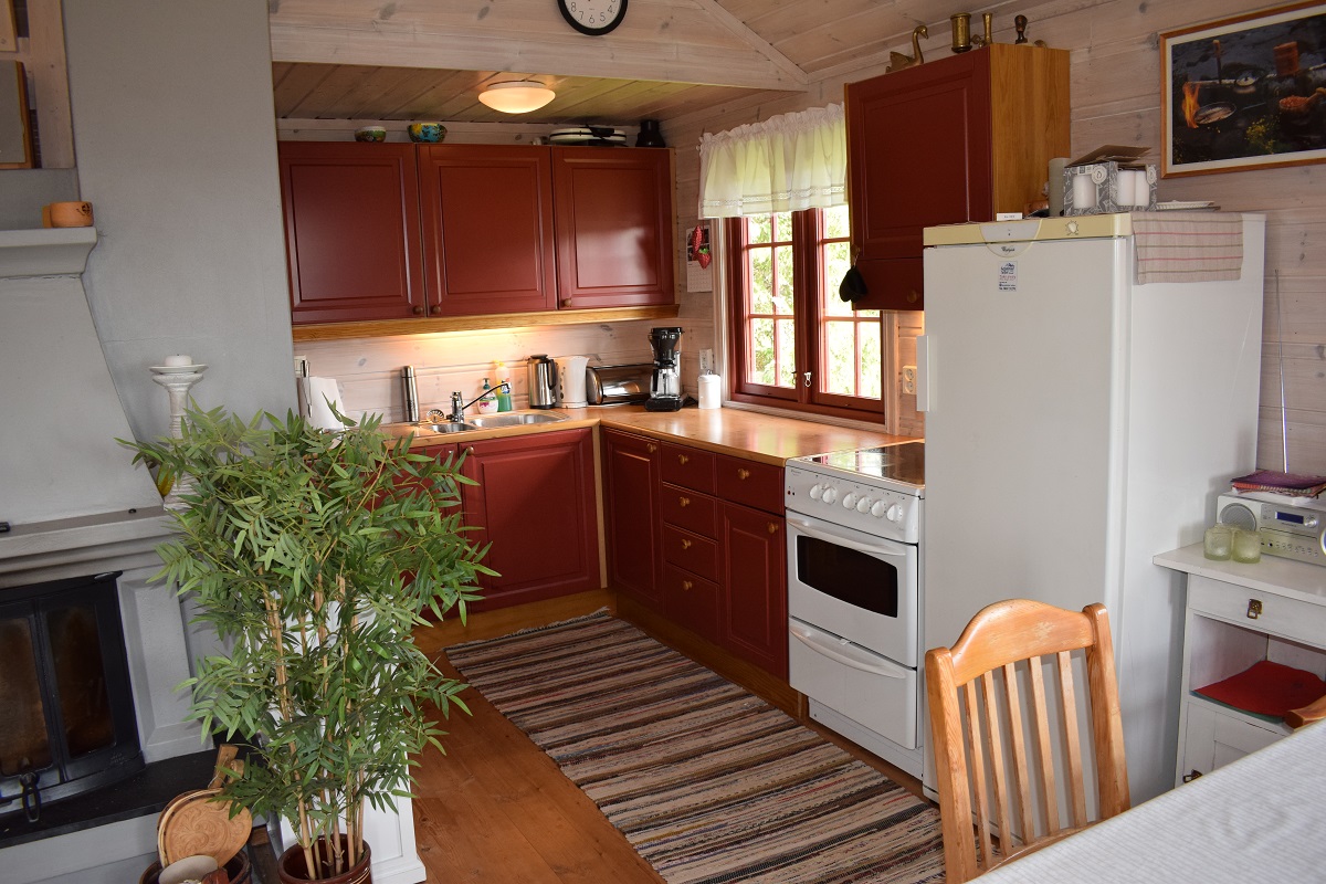 Kjøkken utstyrt for selvhushold: Kjøleskap, oppvaskmaskin, komfyr med 4 plater, kaffetrakter og vannkoker. Egen fryser i teknisk rom/bod.