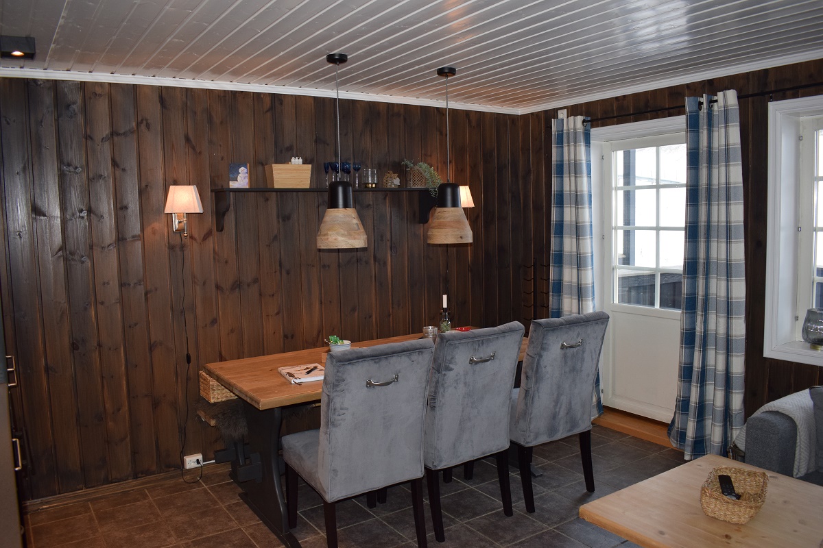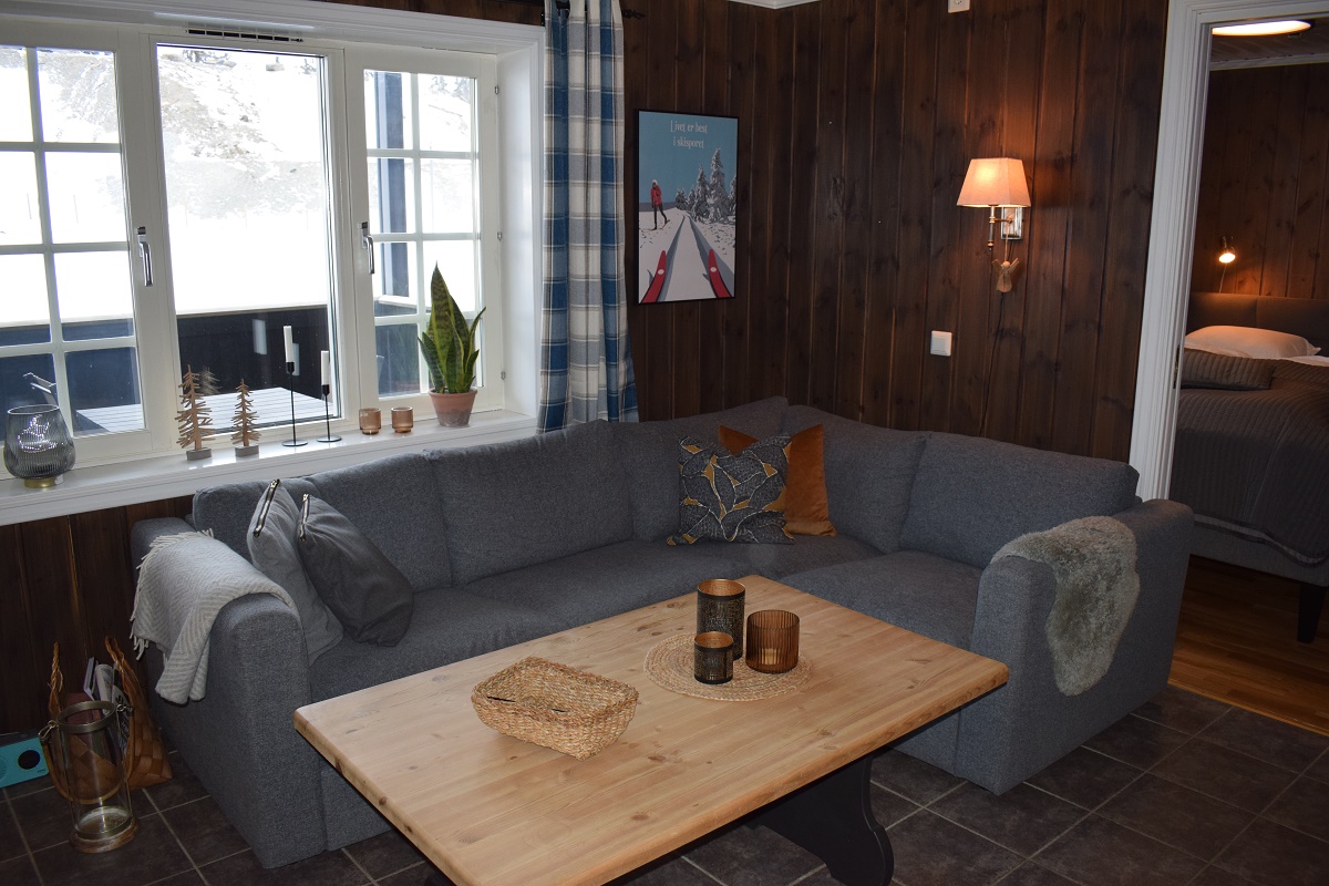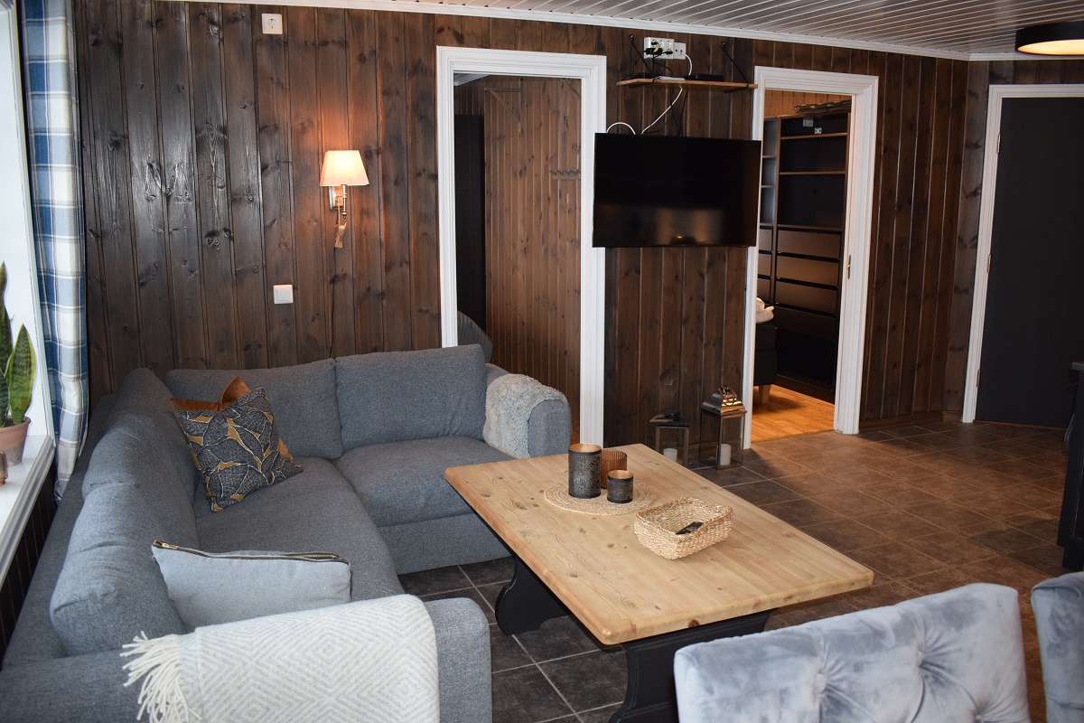 Stue og kjøkken i åpen løsning. Stue inneholder: Sofa, Smart-TV, internett, spisebord til 5 personer. -