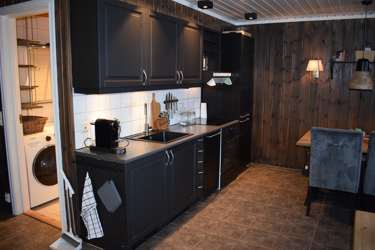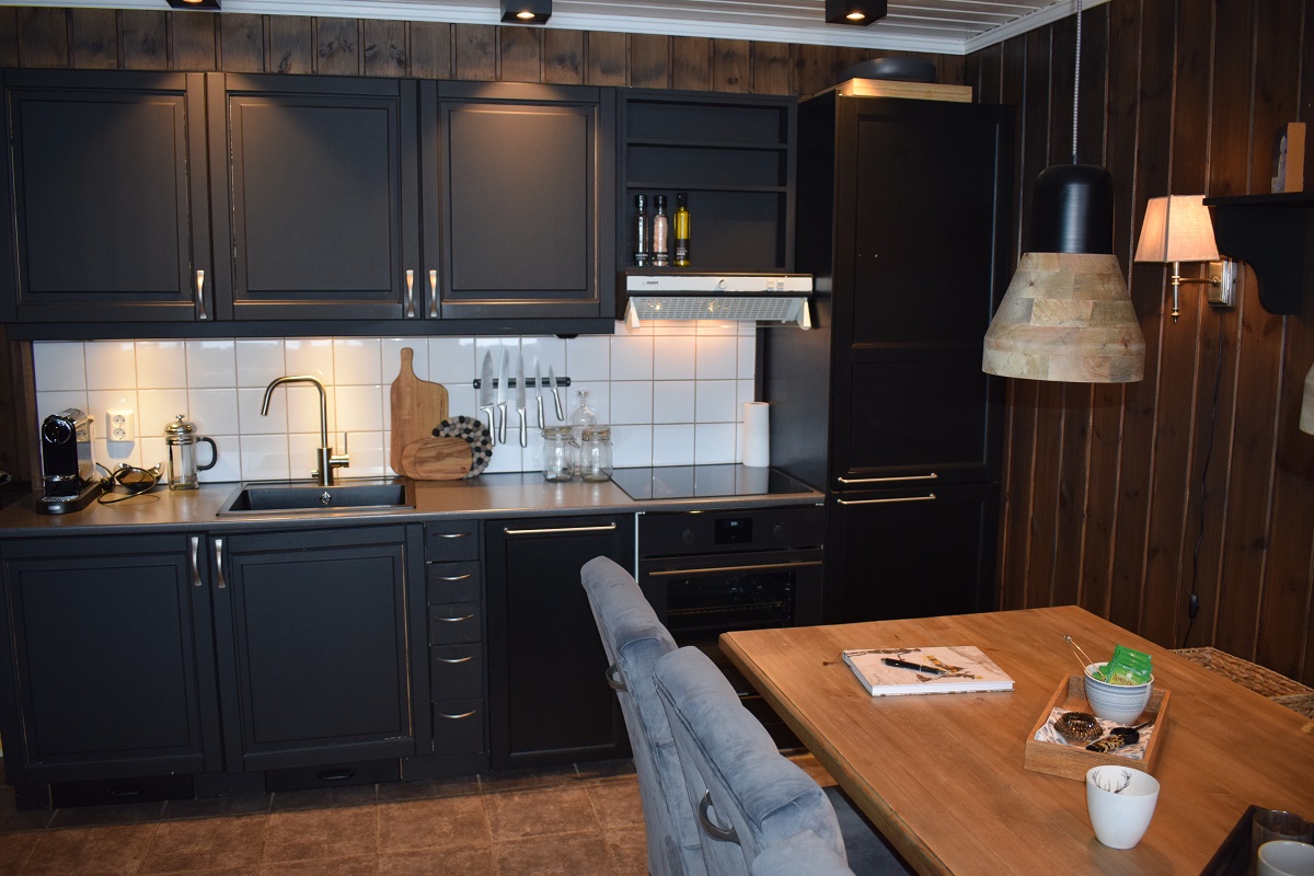 Kjøkken utstyrt for selvhushold: Stort kjøleskap med separat fryser, oppvaskmaskin, komfyr med 4 plater, kaffetrakter og vannkoker.