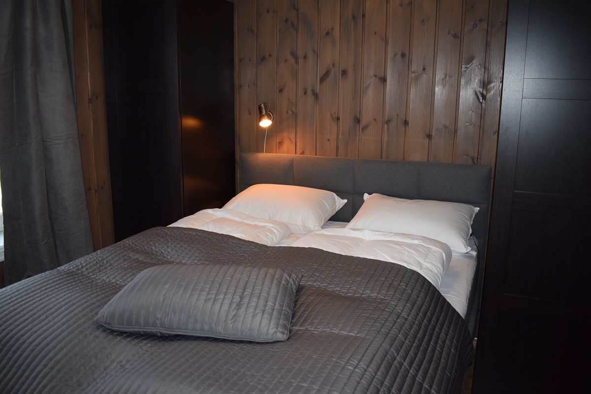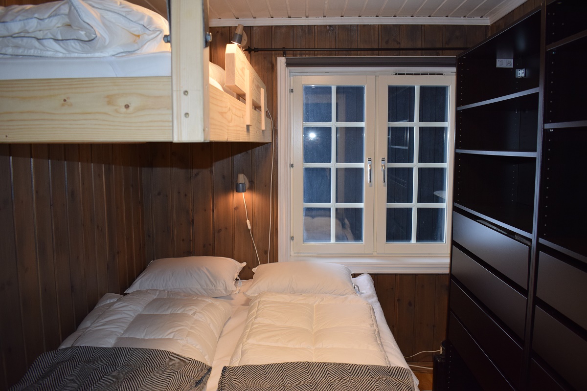Soverom 1: 1 dobbeltseng (150cm bred). Soverom 2: familiekøye (150cm bred underkøye, 90cm bred overkøye).