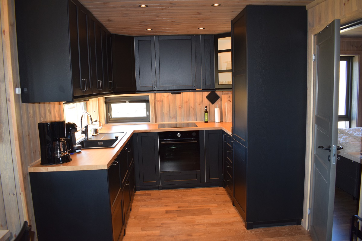 Kjøkken utstyrt for selvhushold: Stort kombiskap med kjøl og frys, oppvaskmaskin, komfyr med 4 soner, kaffetrakter og vannkoker.