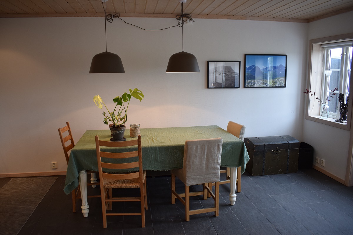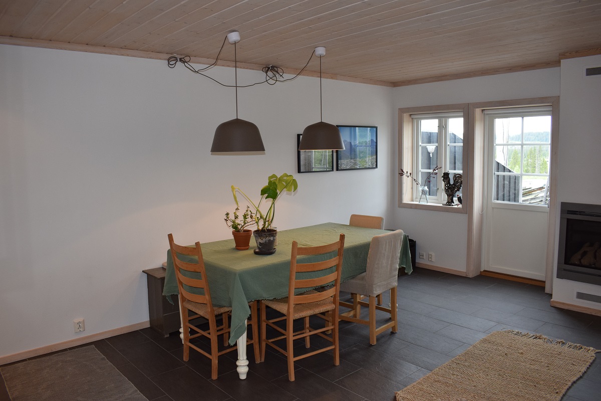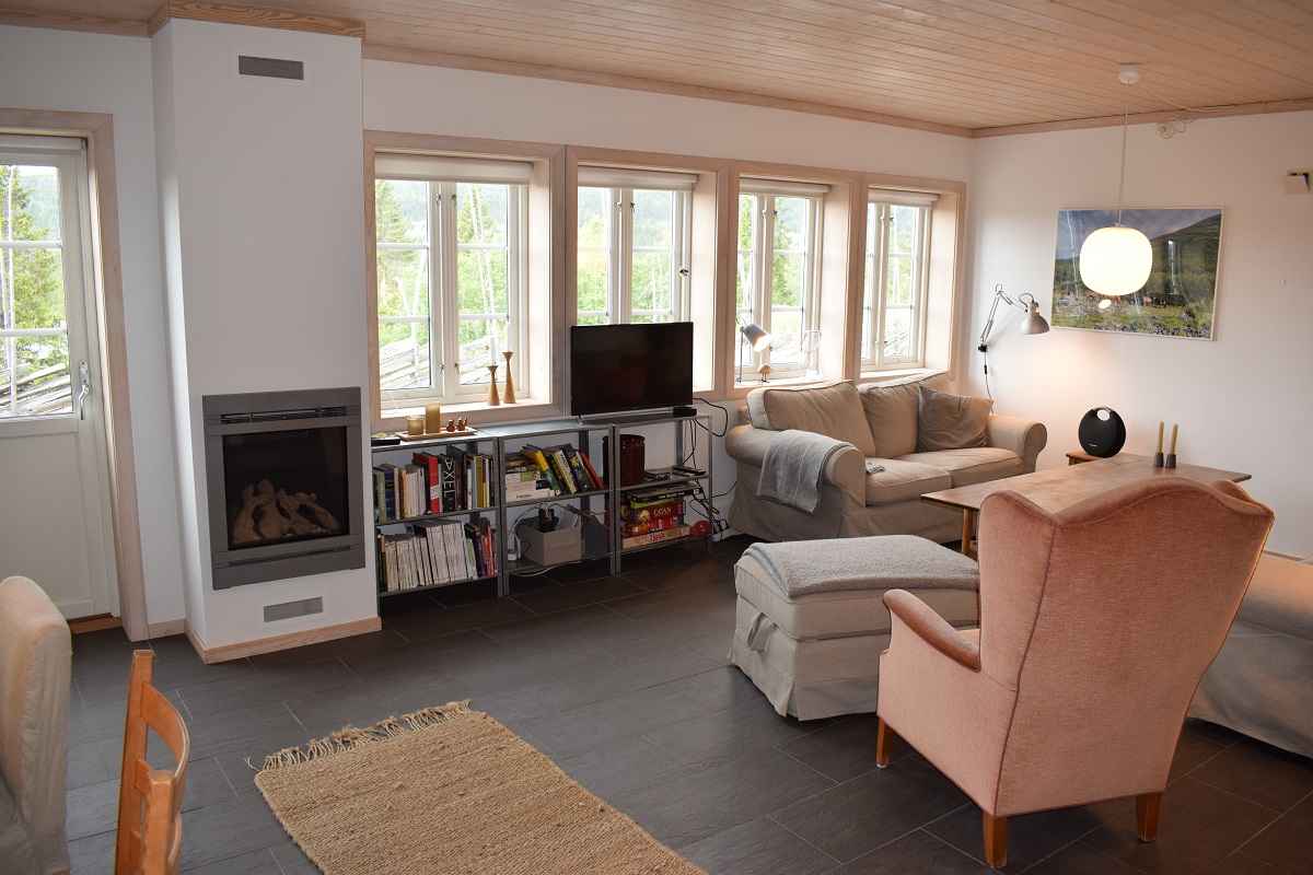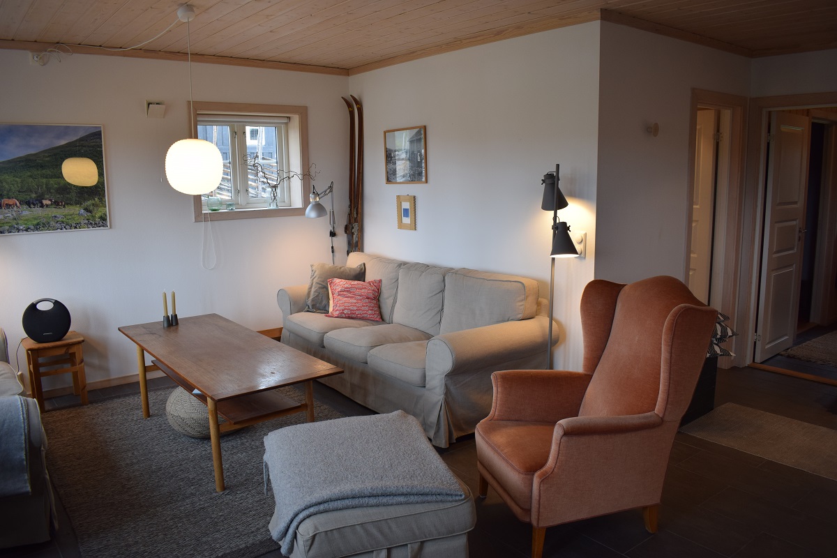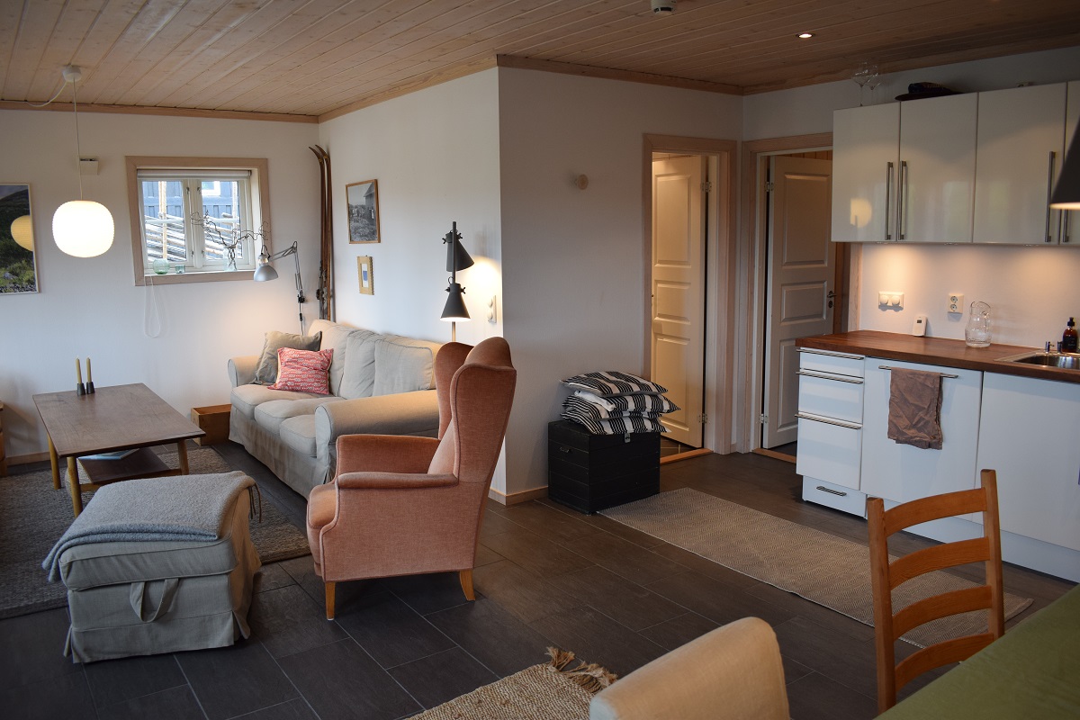 Stue og kjøkken i åpen løsning. Spisebord med plass til 8 personer. Stue inneholder: Sofa, Smart-TV, gasspeis. Internett. Sydvendt uteplass. Liten utebod. Leilighetene er lokalisert i første etasje.