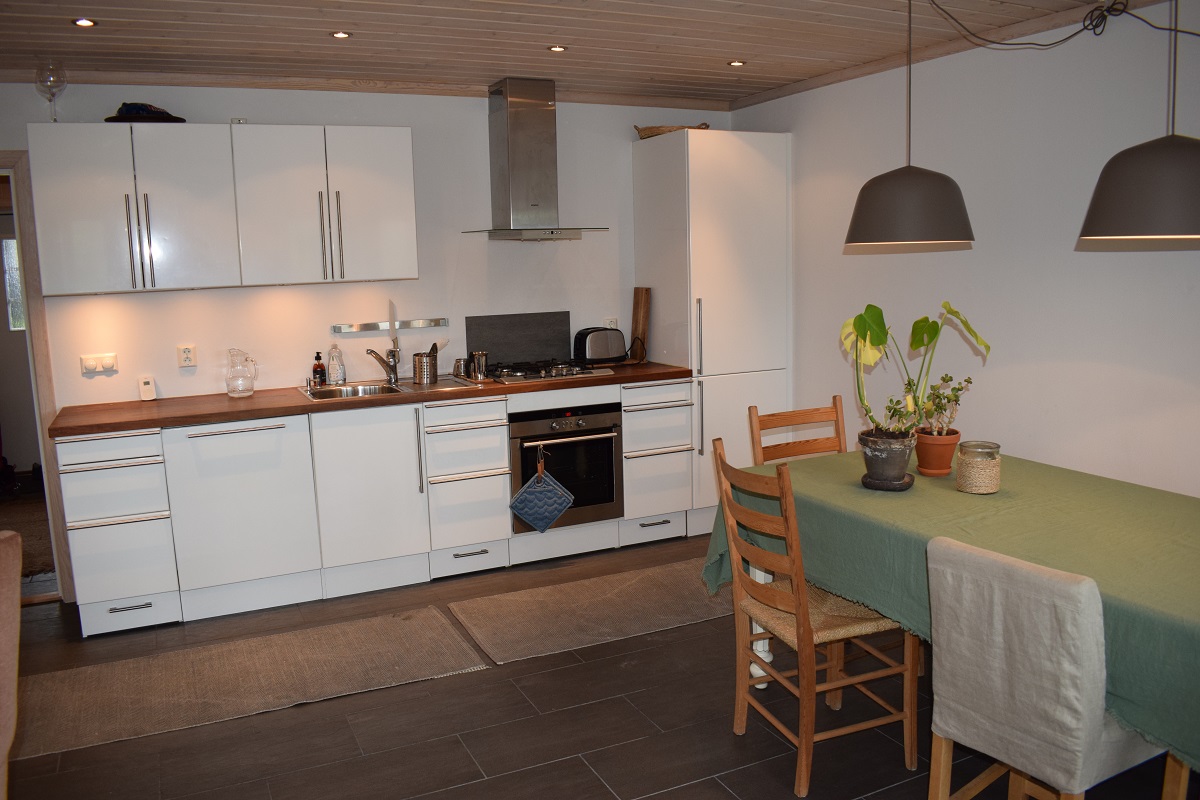 Kjøkken utstyrt for selvhushold: Kjøleskap/fryser, oppvaskmaskin, gasskomfyr med 4 bluss, kaffetrakter og vannkoker.