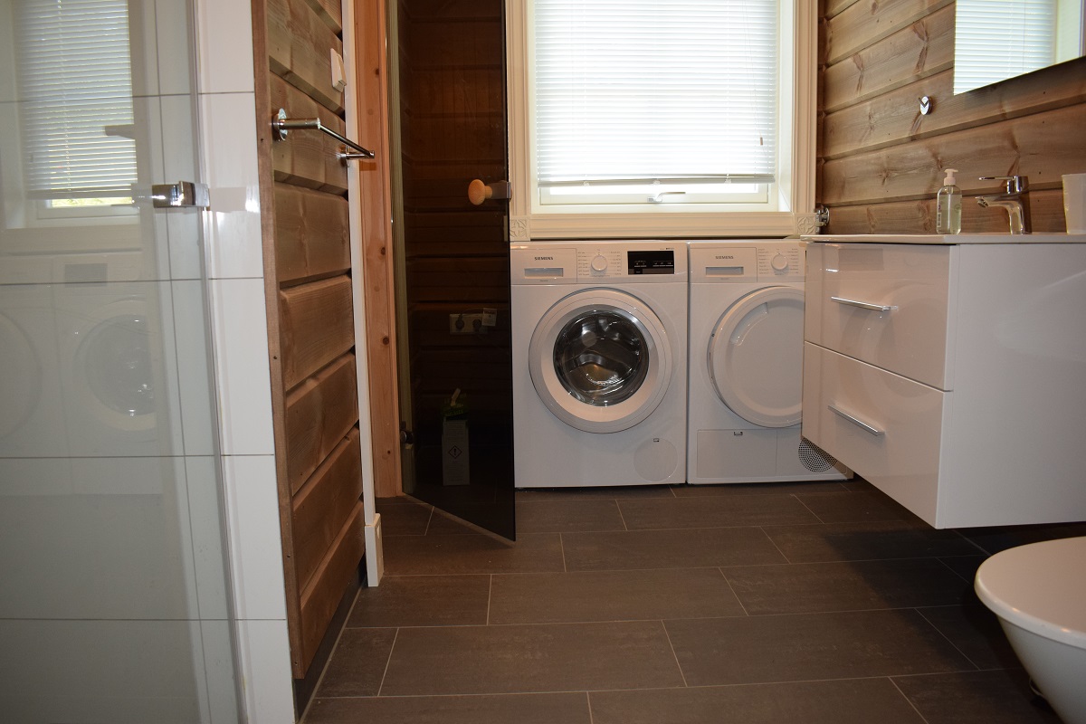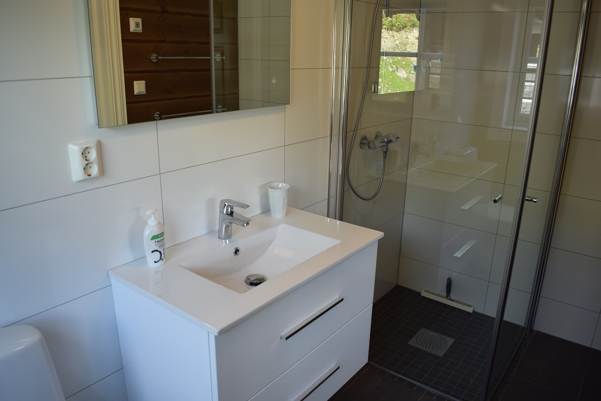 Bad 2 (i første etasje): dusj, toalett, vask, sauna. Vaskemaskin og tørketrommel.