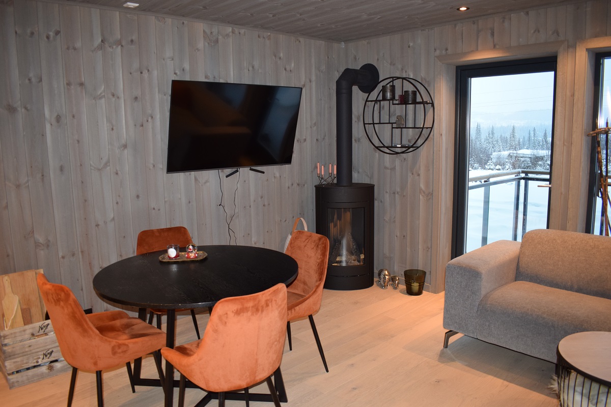 Stue og kjøkken i åpen løsning. Stue inneholder: Sofa og smart-TV. Internett. Spisebord med plass til 5 personer.
