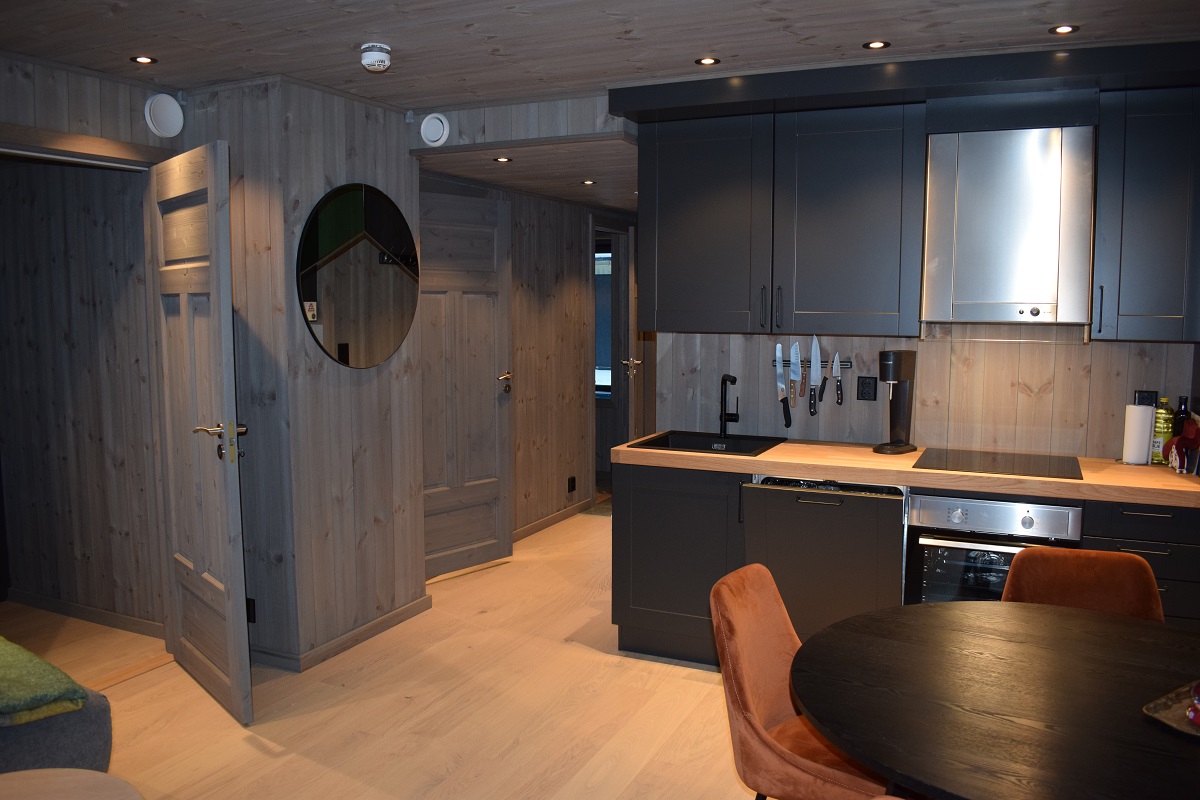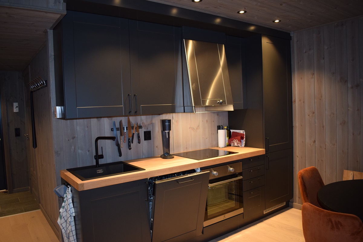 Kjøkken utstyrt for selvhushold: Kjøleskap med fryser, komfyr med 4 plater, oppvaskmaskin, presskanne for kaffe og vannkoker.